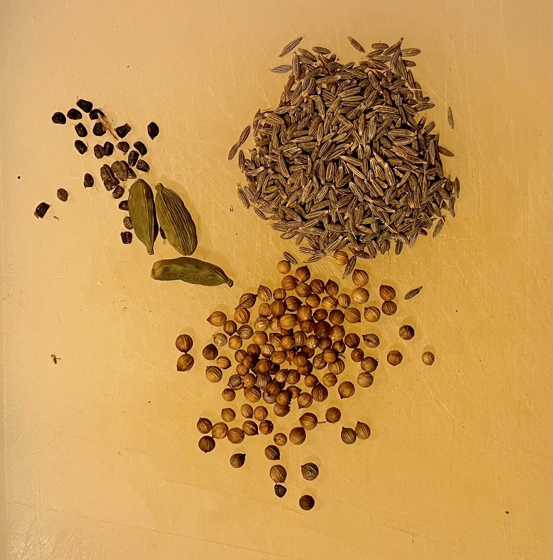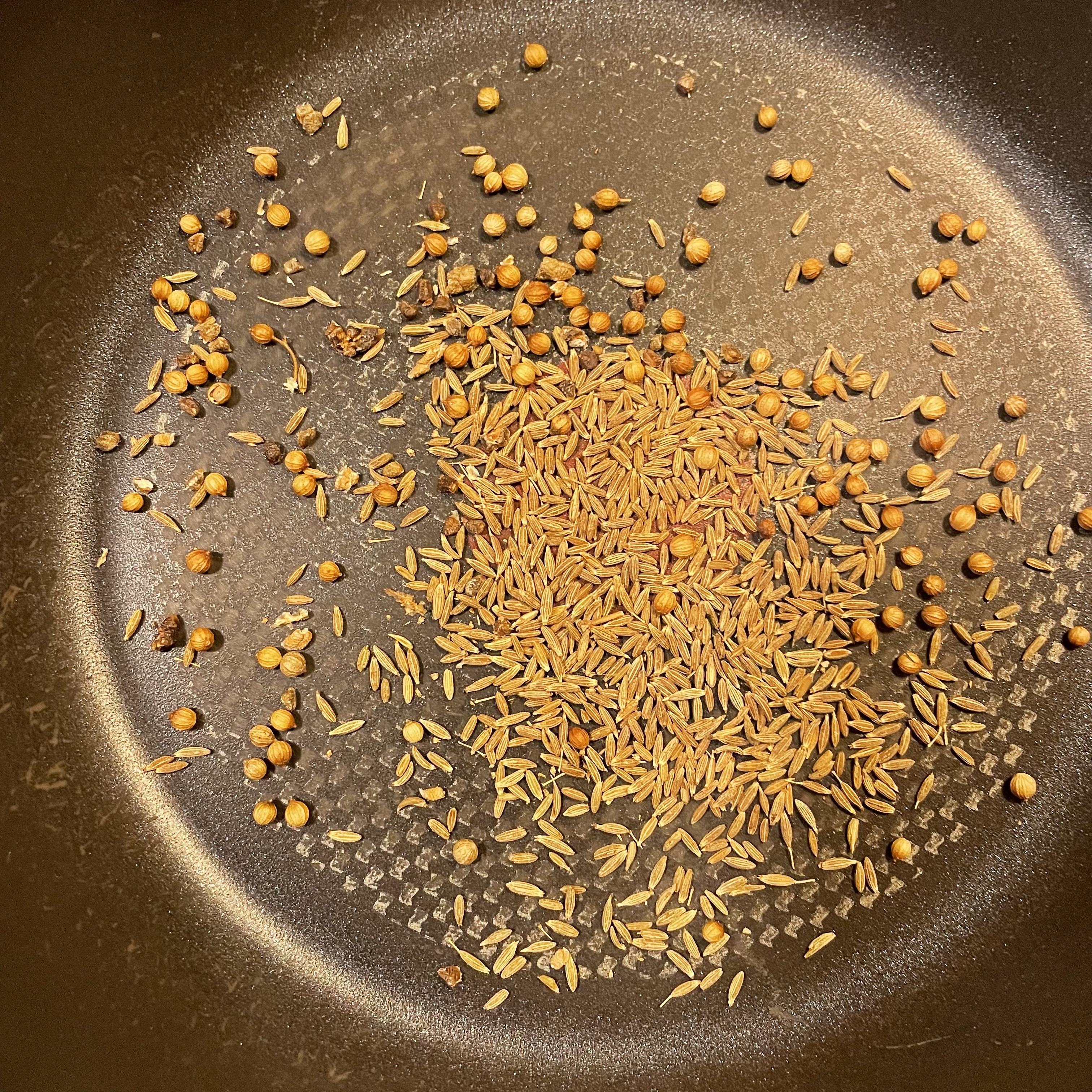 - Put the coriander, cumin, and cardamom seeds into a dry skillet. Toast the spices lightly over medium heat, shaking the pan frequently, just until they become fragrant, about 4 minutes. Let these cool for a few minutes, then grind fine in a spice grinder or with a mortar and pestle.