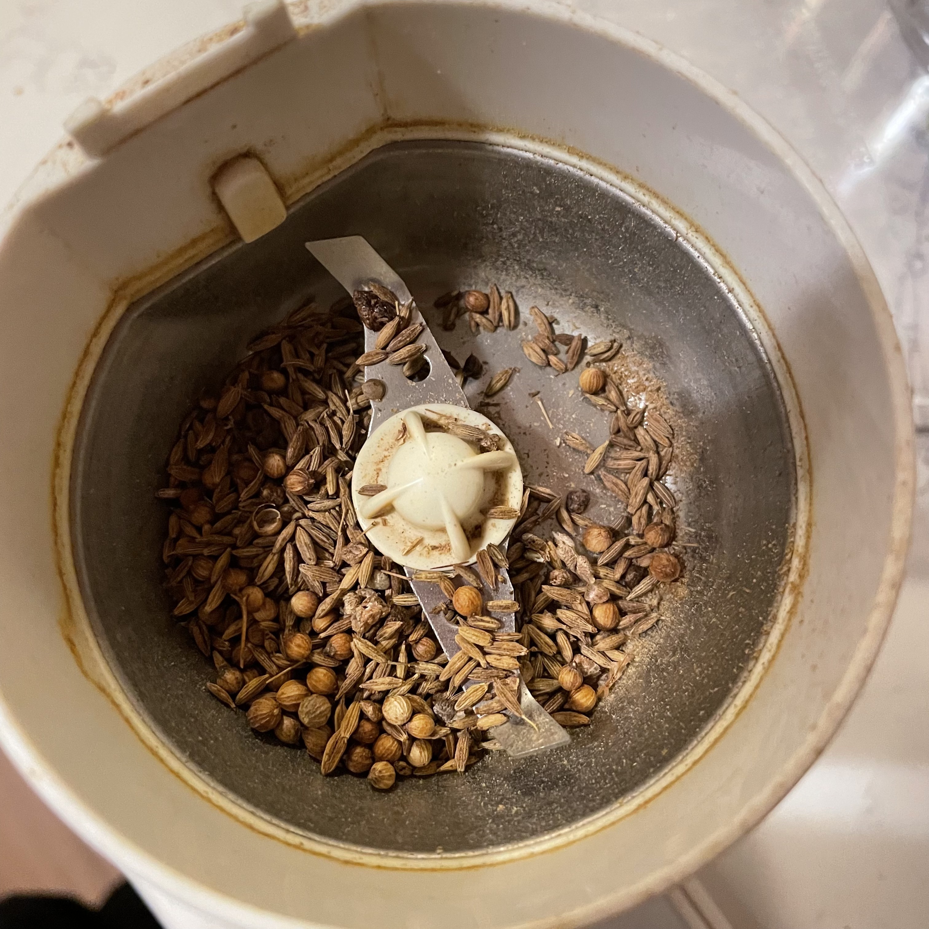 Making the dip starts with toasting and grinding some coriander, cumin, and cardamon seeds. Toasting brings out the flavors a little more, so don’t skip this step. I use a cheap $10 coffee grinder from Amazon for grinding spices (and ONLY grinding spices), but you could also use a mortar and pestle here.