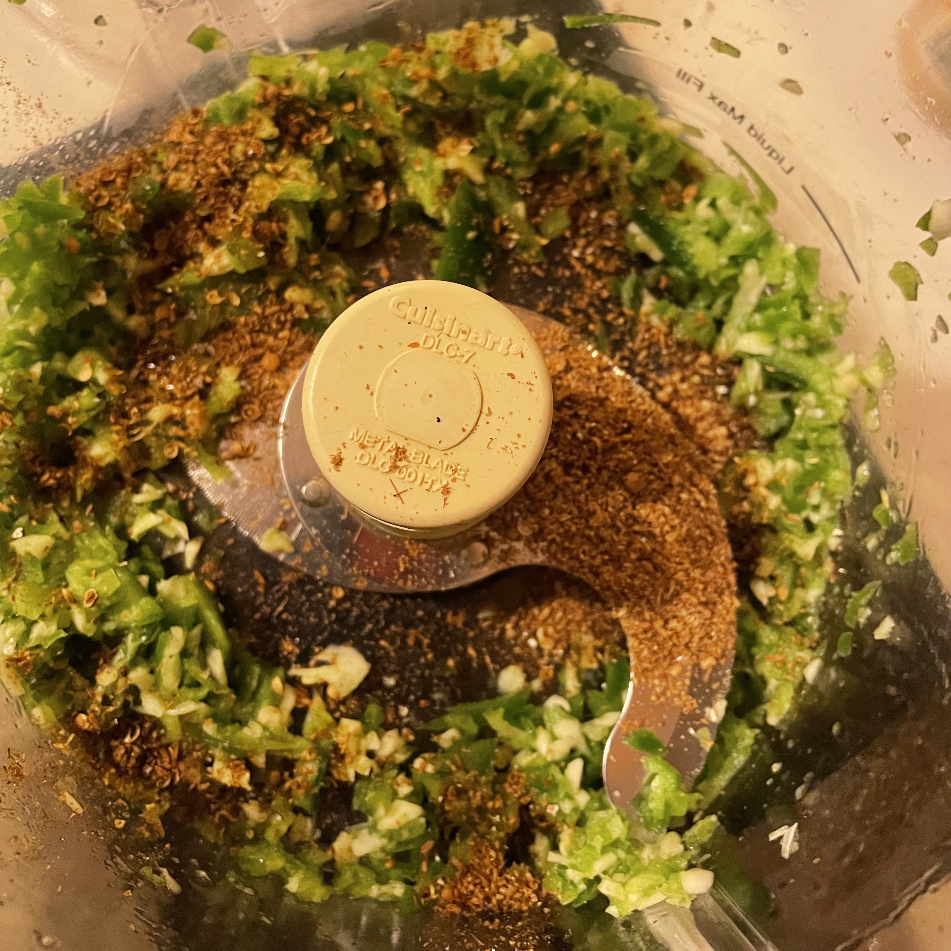 - Put the chiles and garlic in a food processor and pulse a few times until they are fairly finely chopped. Add the cilantro, parsley, the mixture from the spice grinder, ground cloves, lemon zest, lemon juice, 1 tsp kosher salt, and a few shakes of black pepper. Pulse until all is finely chopped into a rough puree.