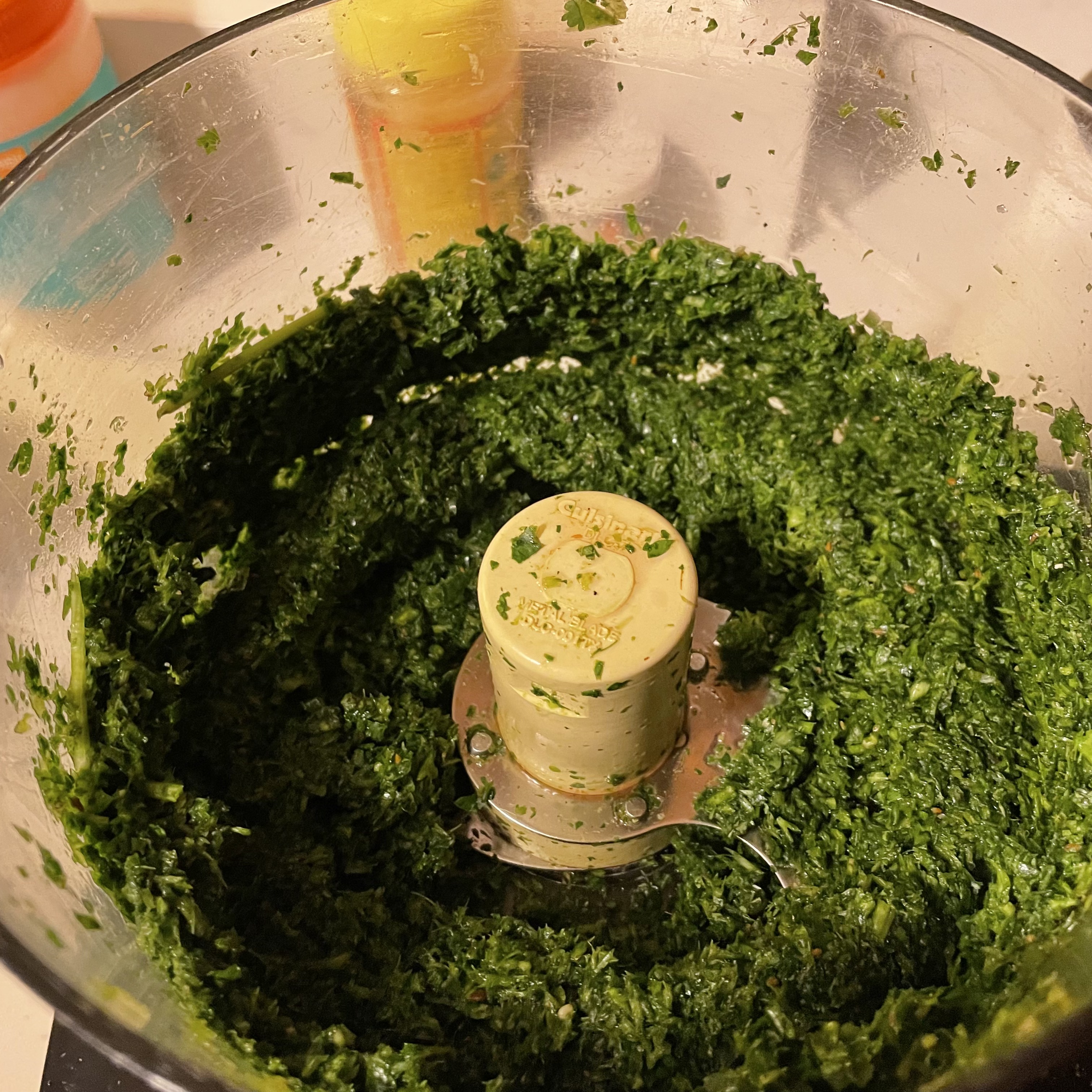 The sauce comes together in layers – first you chop the peppers and garlic, then add the cilantro and parsley and let that get all chopped up, then add the lemon and spices. This all gets finished off with olive oil, and then, since we want this to be a dip, some avocado. I later thinned this out with a few spoonfuls of greek yogurt to balance out the avocado with some extra “tang”.