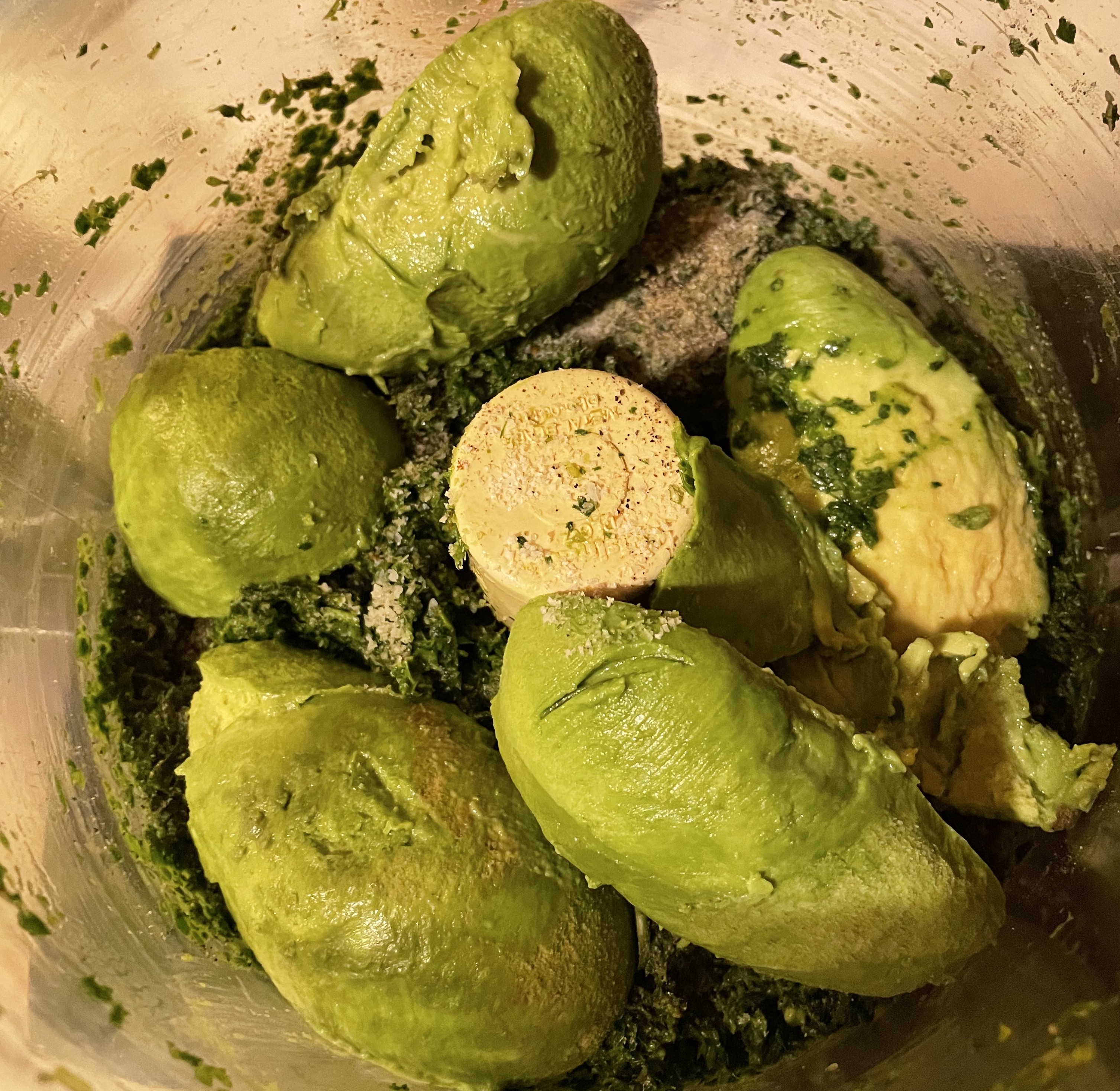- With the motor running, drizzle in the olive oil. Stop before the sauce is completely blended smooth. add the flesh of the avocado and continue to mix until completely combined, but still textured.
