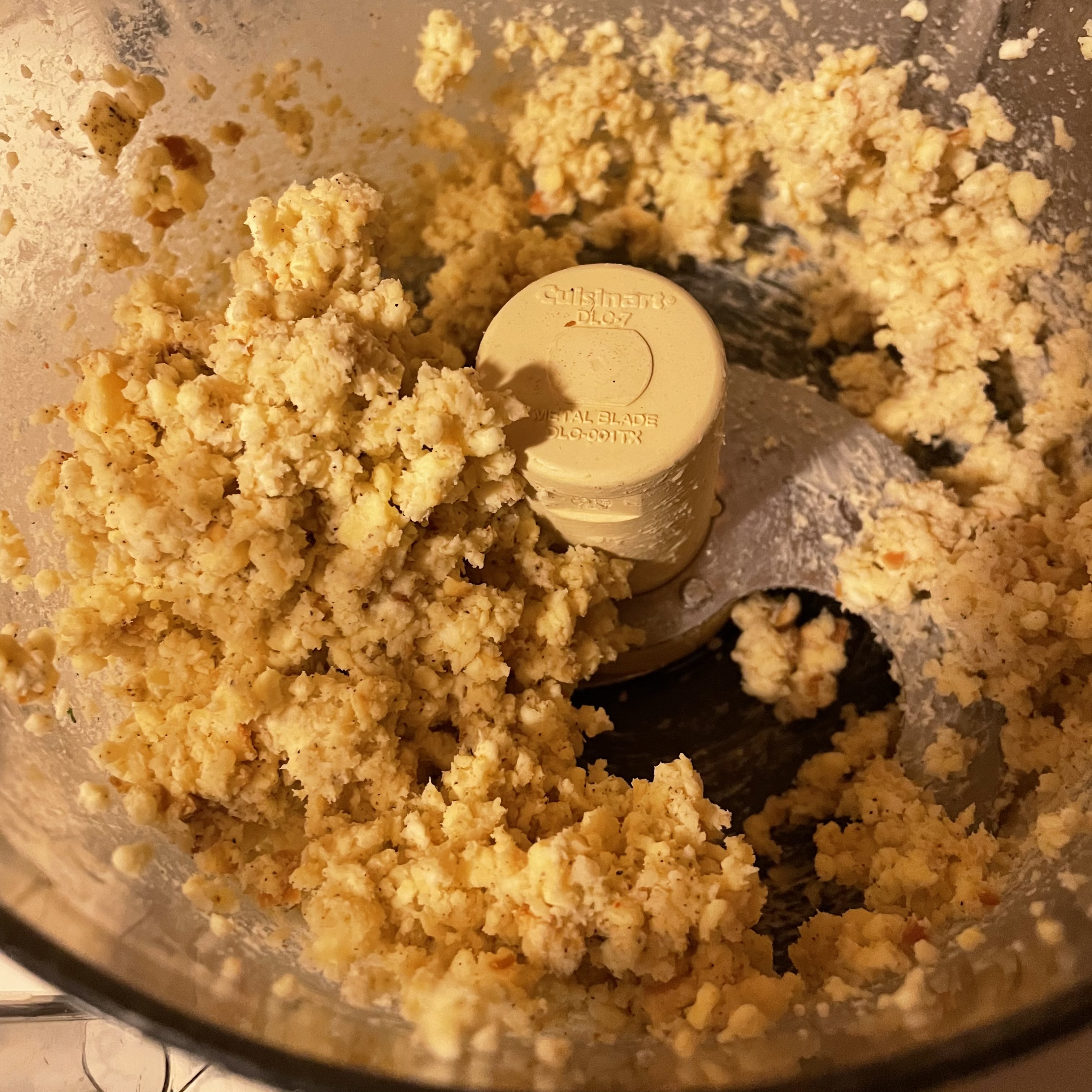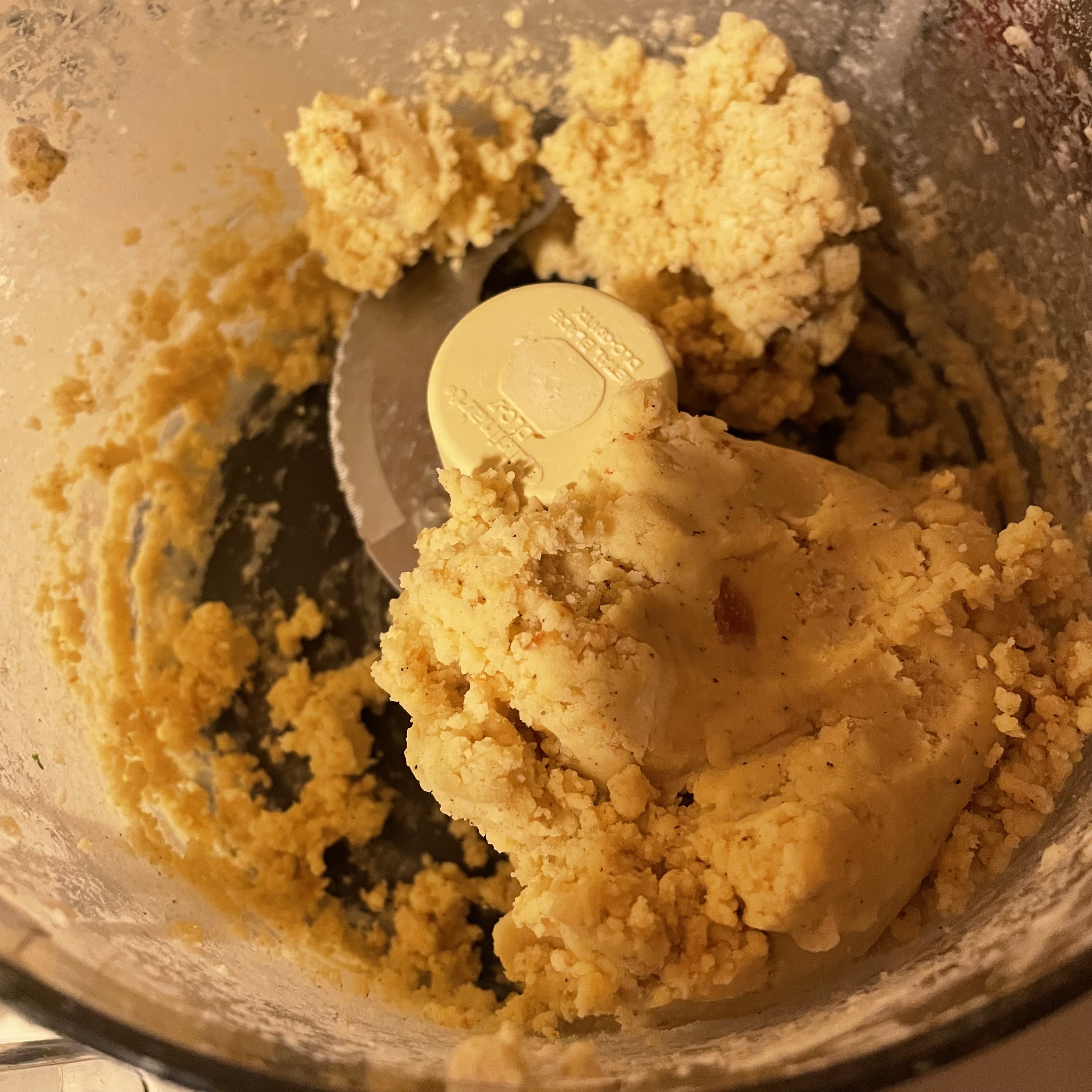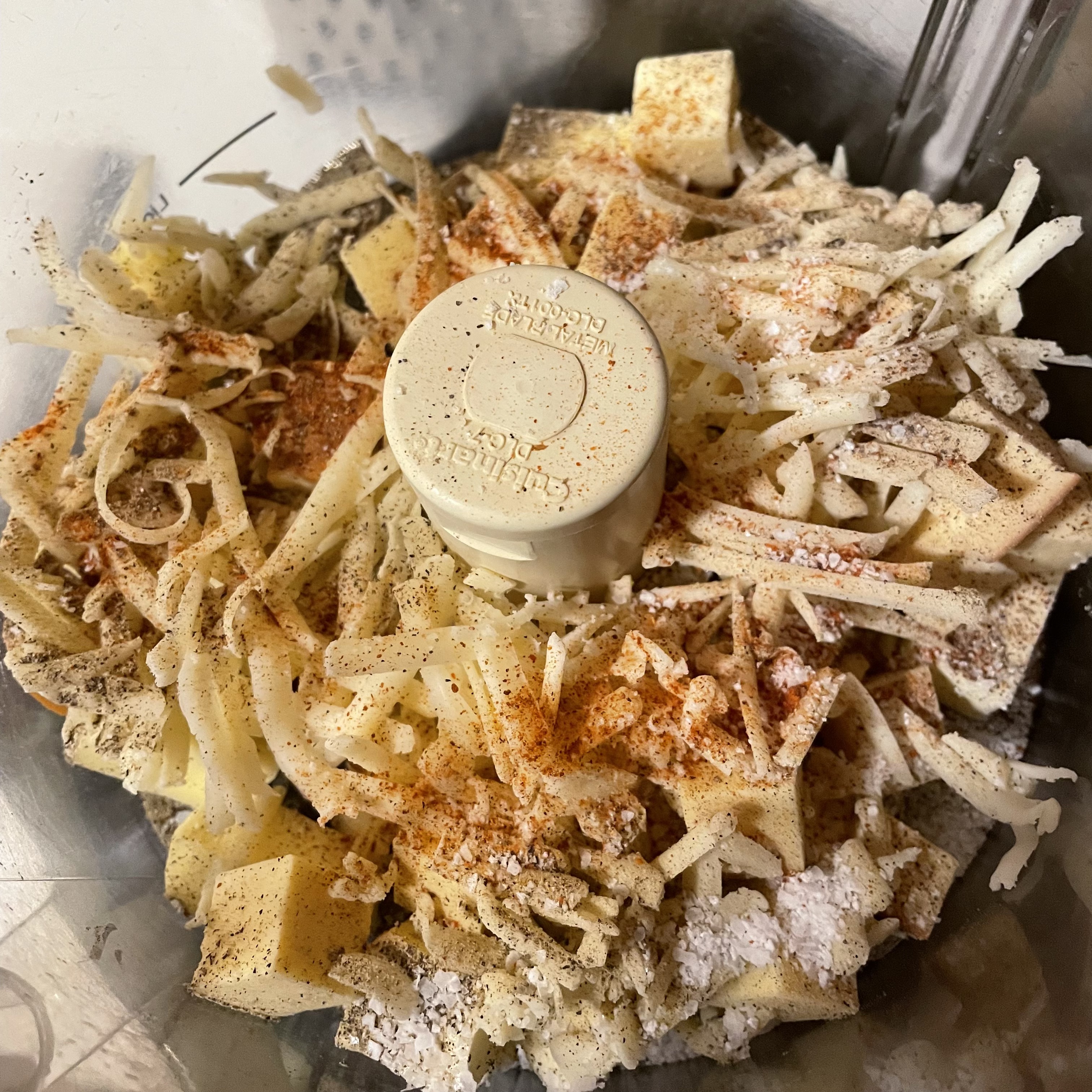 - Put the cold butter, Gouda, cheddar, salt, black pepper, and cayenne in a food processor and pulse until the butter is in bits and the mixture forms small curds. Add the flour and pulse again, in long pulses, until the dough is moist and forms larger, popcorn-like curds.