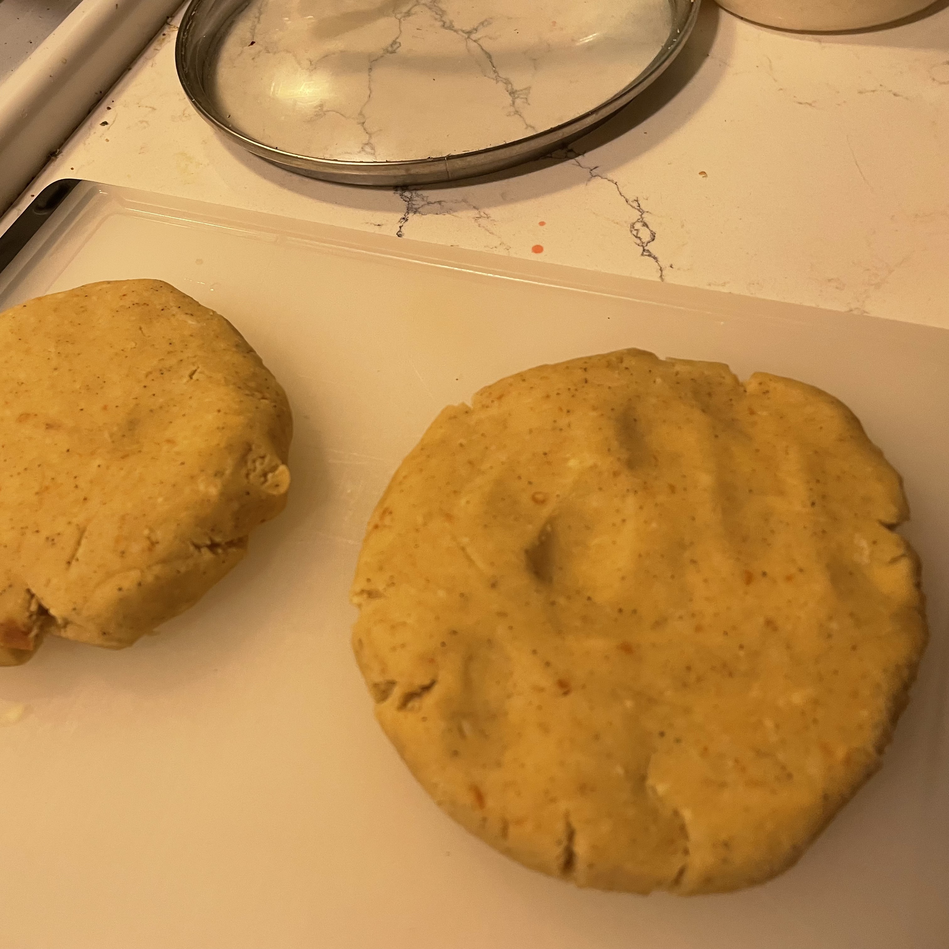 Once that’s in place, that gets split into two “patties” you can roll out to 1/4 inch thickness, place between layers of parchement, and let hang out in the fridge for 4-5 hours to firm up. You can also cheat by putting this in the freezer for one.
