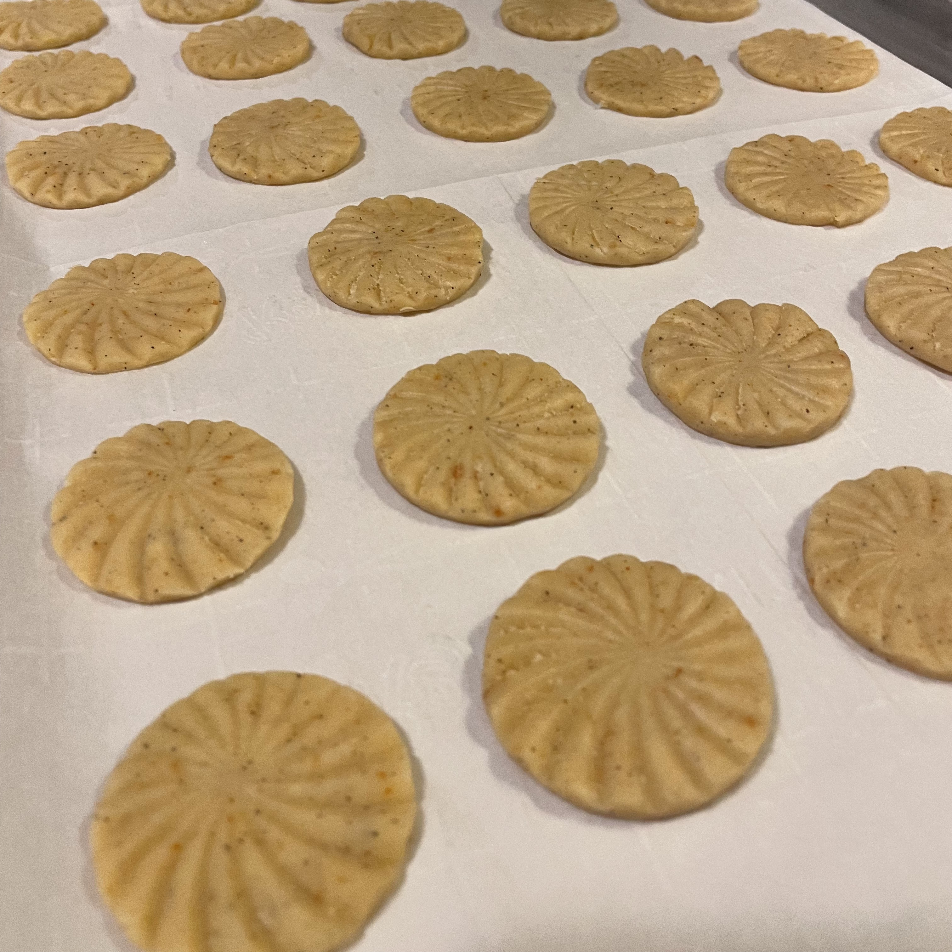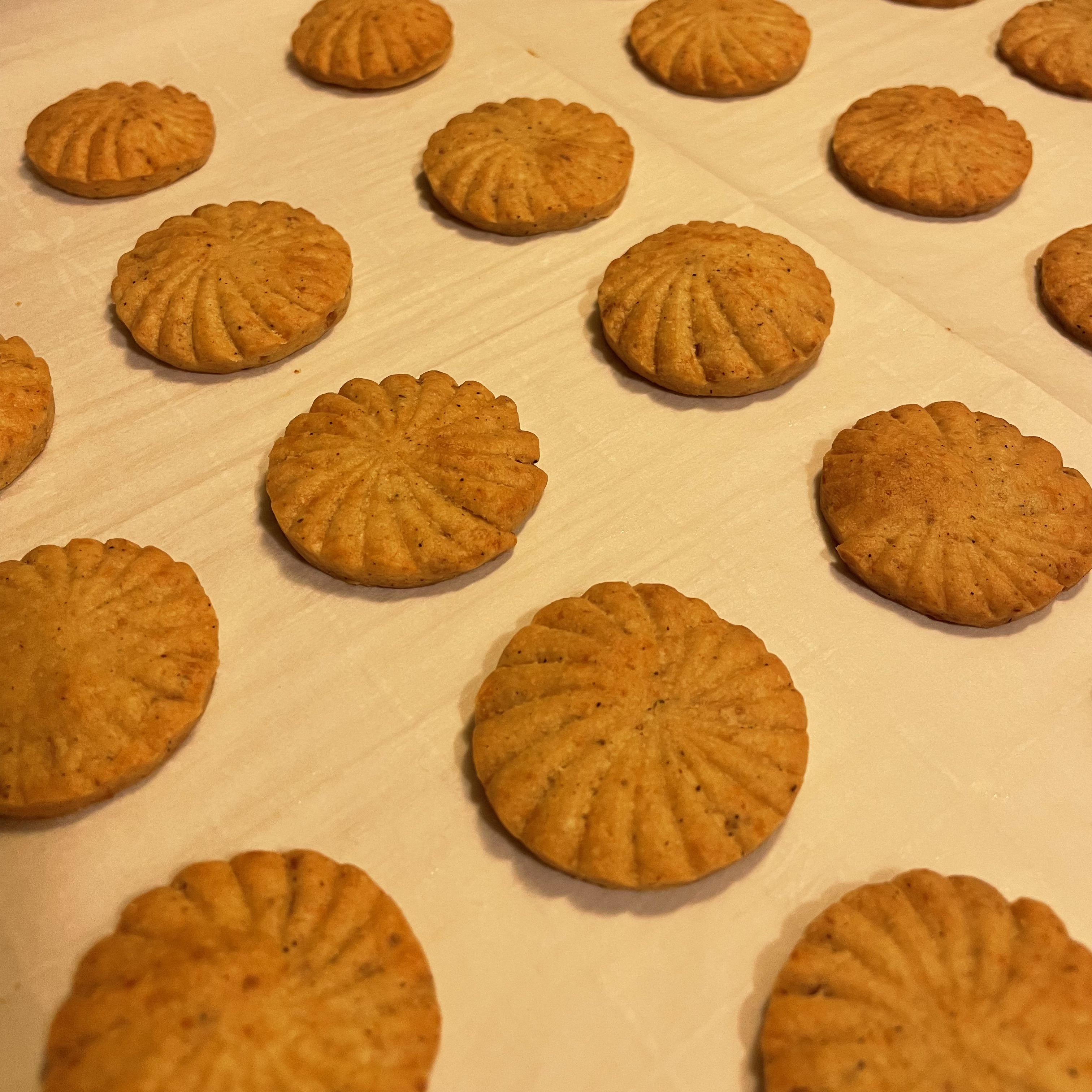 Each sheet of these bakes for 16-18 minutes and comes out slightly puffed and golden. Let them cool on the sheet for a few minutes, then finish cooling on a rack.