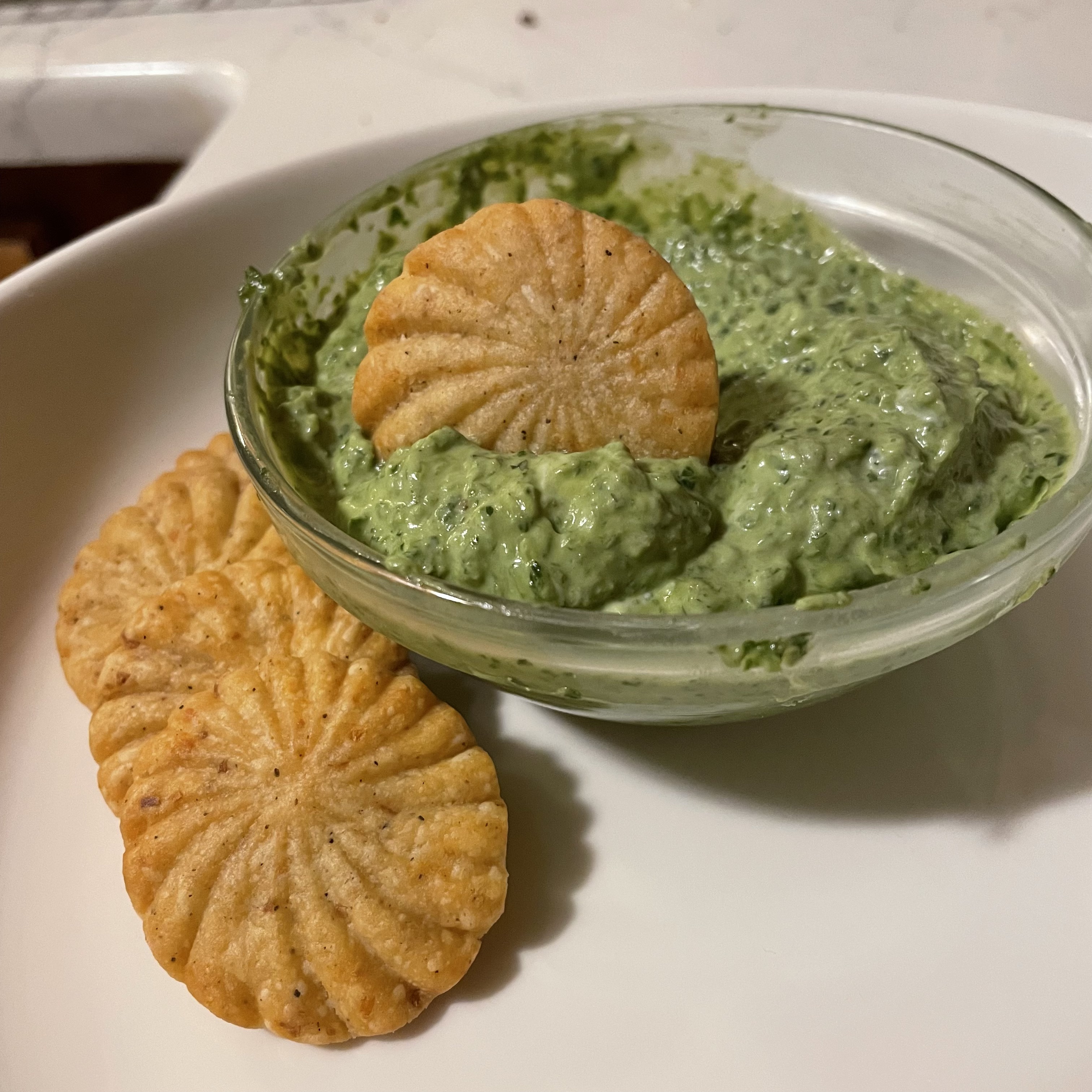 Given how truly cheesy this movie is, it made sense to make the cookies cheesy as well, so I dug up a smoked gouda cookie recipe from Dorie Greenspan, and to balance that out, I made a dip from my favorite chimichurri-esque sauce from Joshua McFadden’s Six Seasons by adding some avocado and greek yogurt.