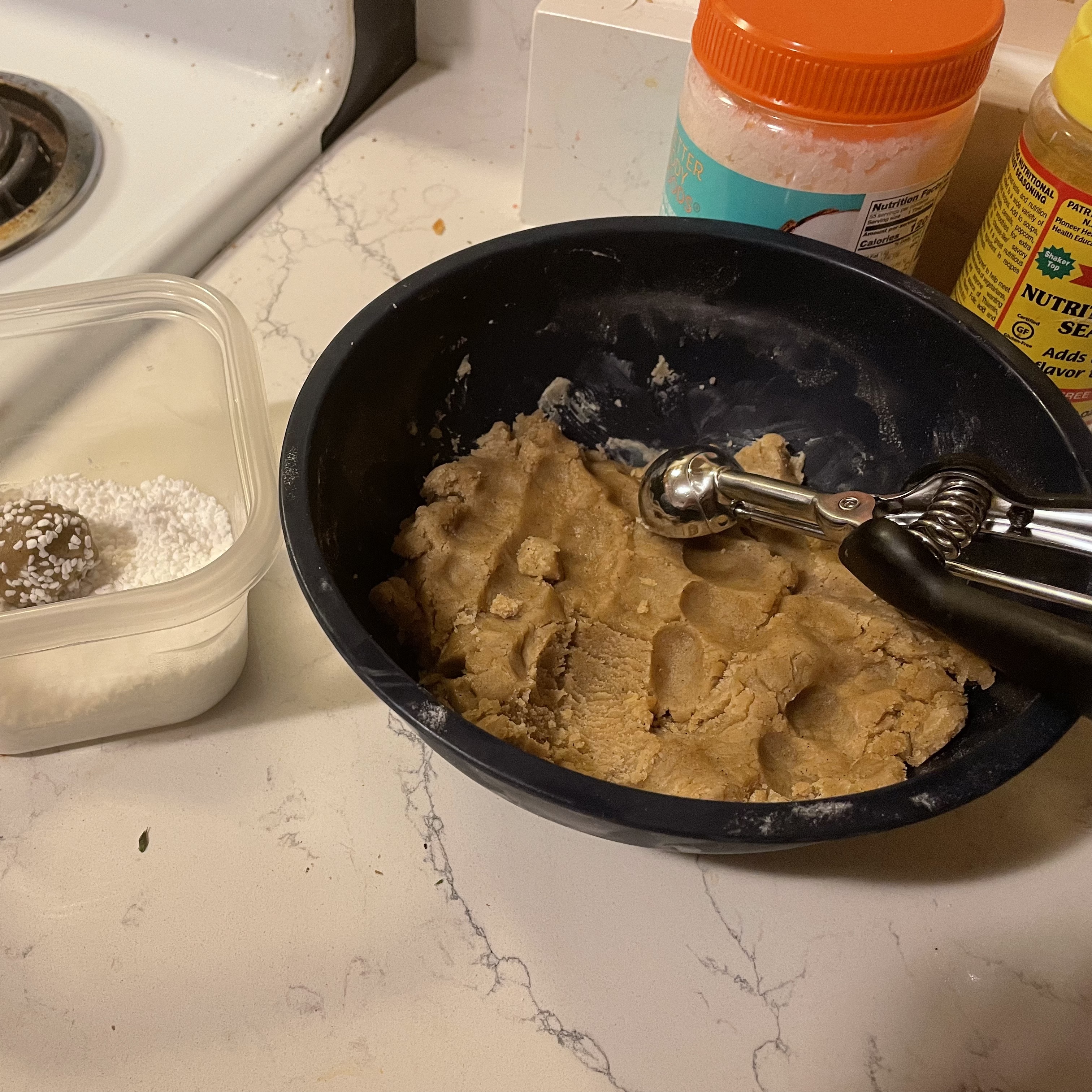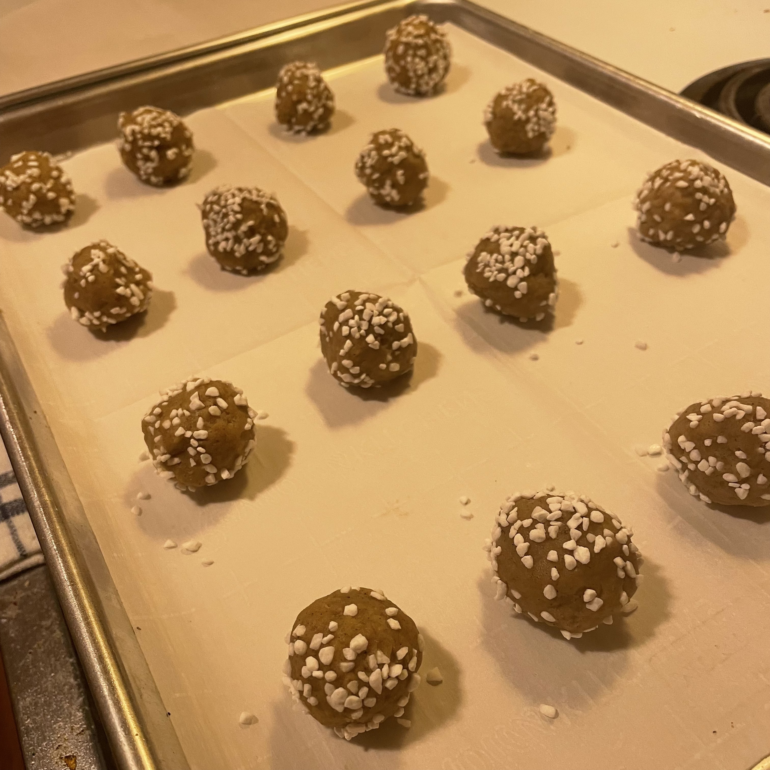- Scoop the dough by the heaping teaspoon and roll into balls. Roll each ball in pearl sugar and place on the baking sheet, 1” apart.