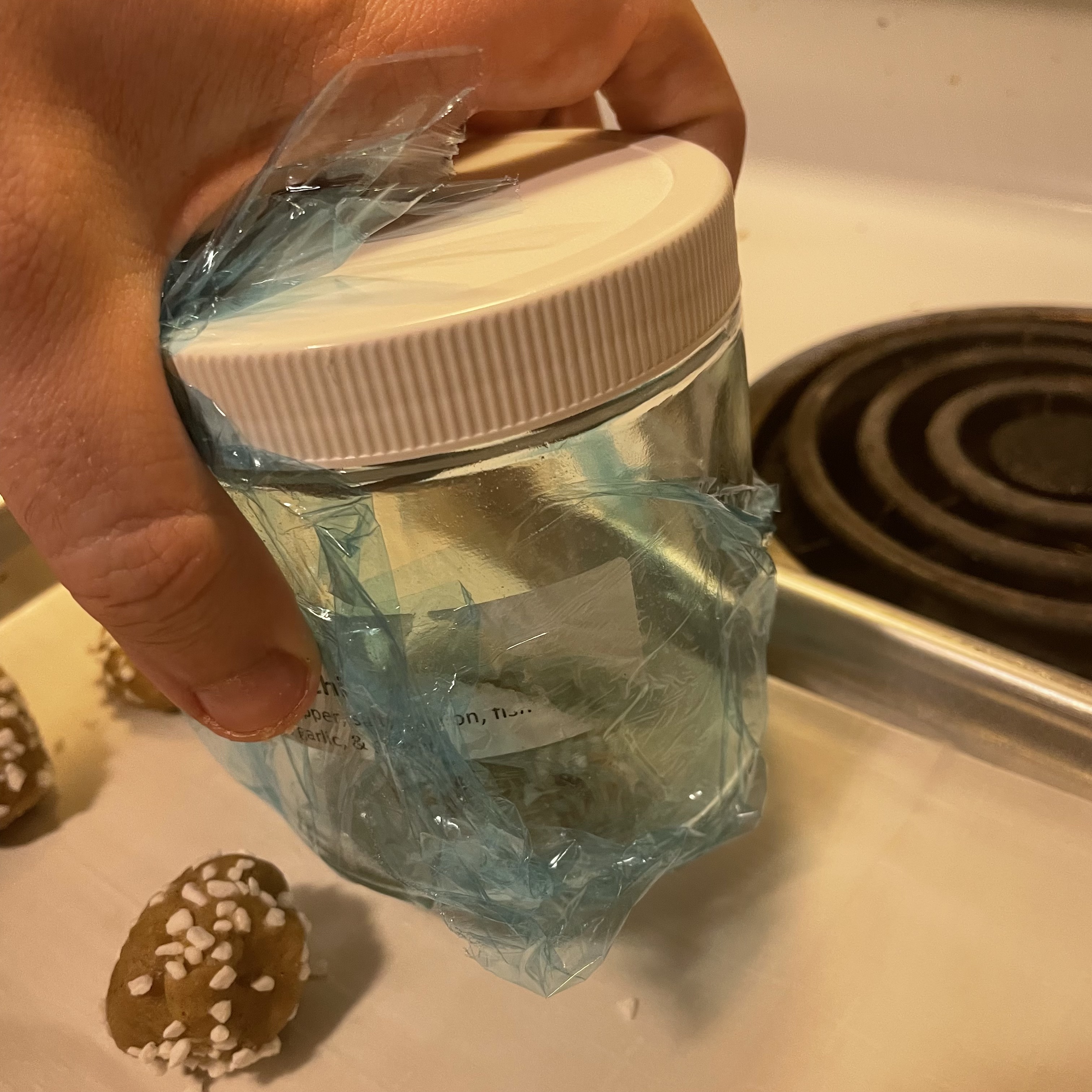 Before getting baked, the cookies get a quick press from a plastic wrap-lined jar.