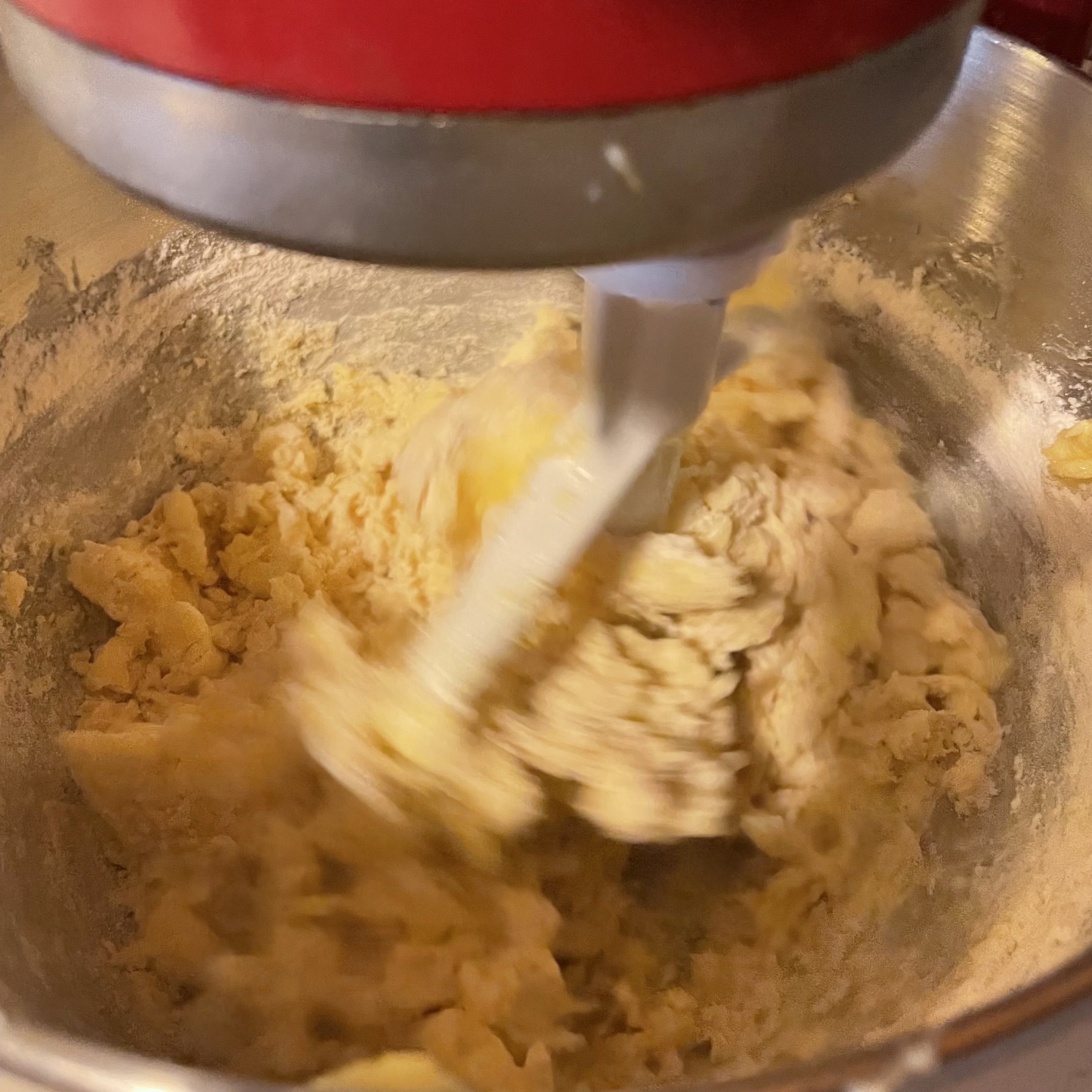 - Reduce the speed to low and gradually add the flour until mostly combined. Give a final few stirs with a rubber spatula to ensure the flour is totally incorporated (the dough will be thick).