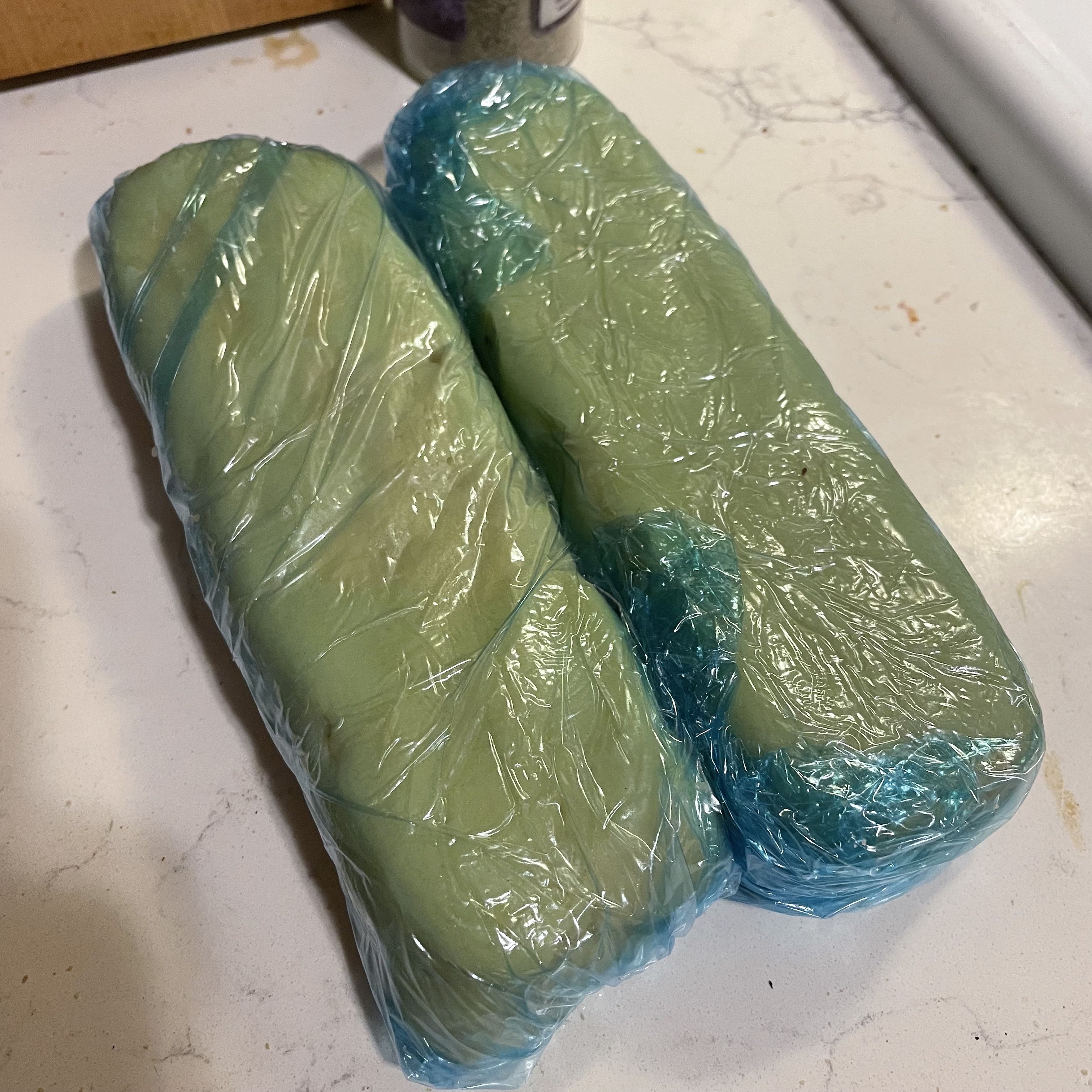 - Split your dough into two halves, and gently shape each half into a ovoid-rectangular log. Set in the fridge or freezer for 1-2 hours to let the butter rest.