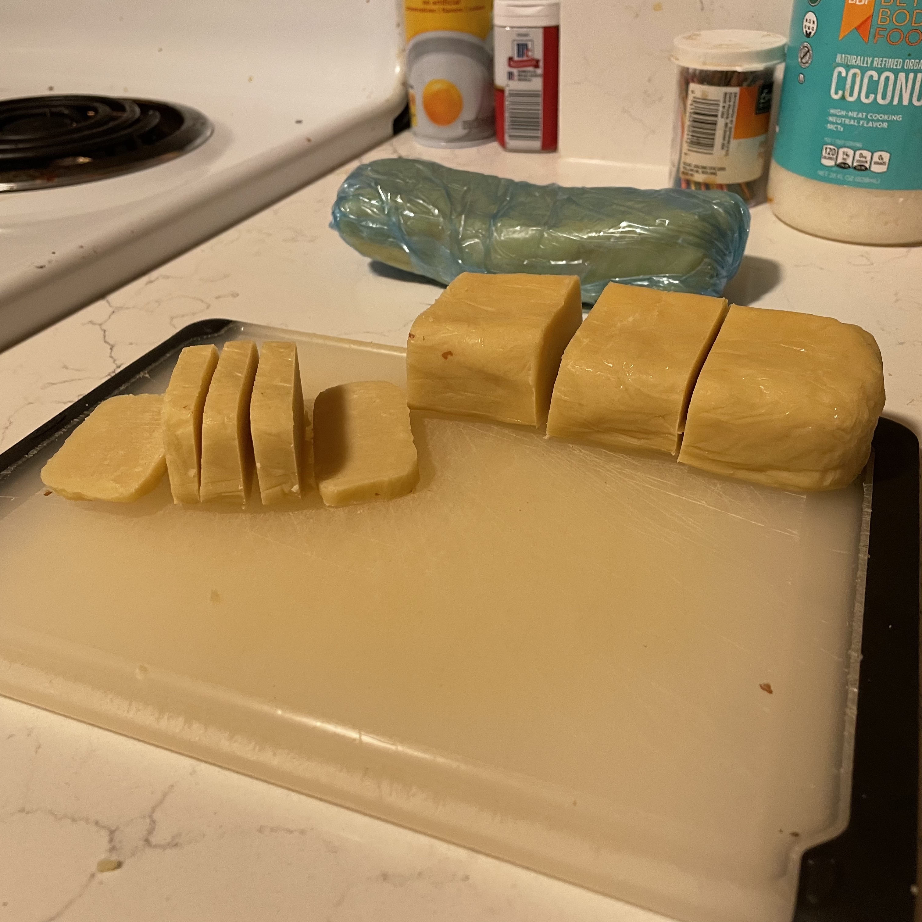 - Slice each log into 18-22 cookies, arranging these neatly on your baking sheet with a little bit of elbow room.