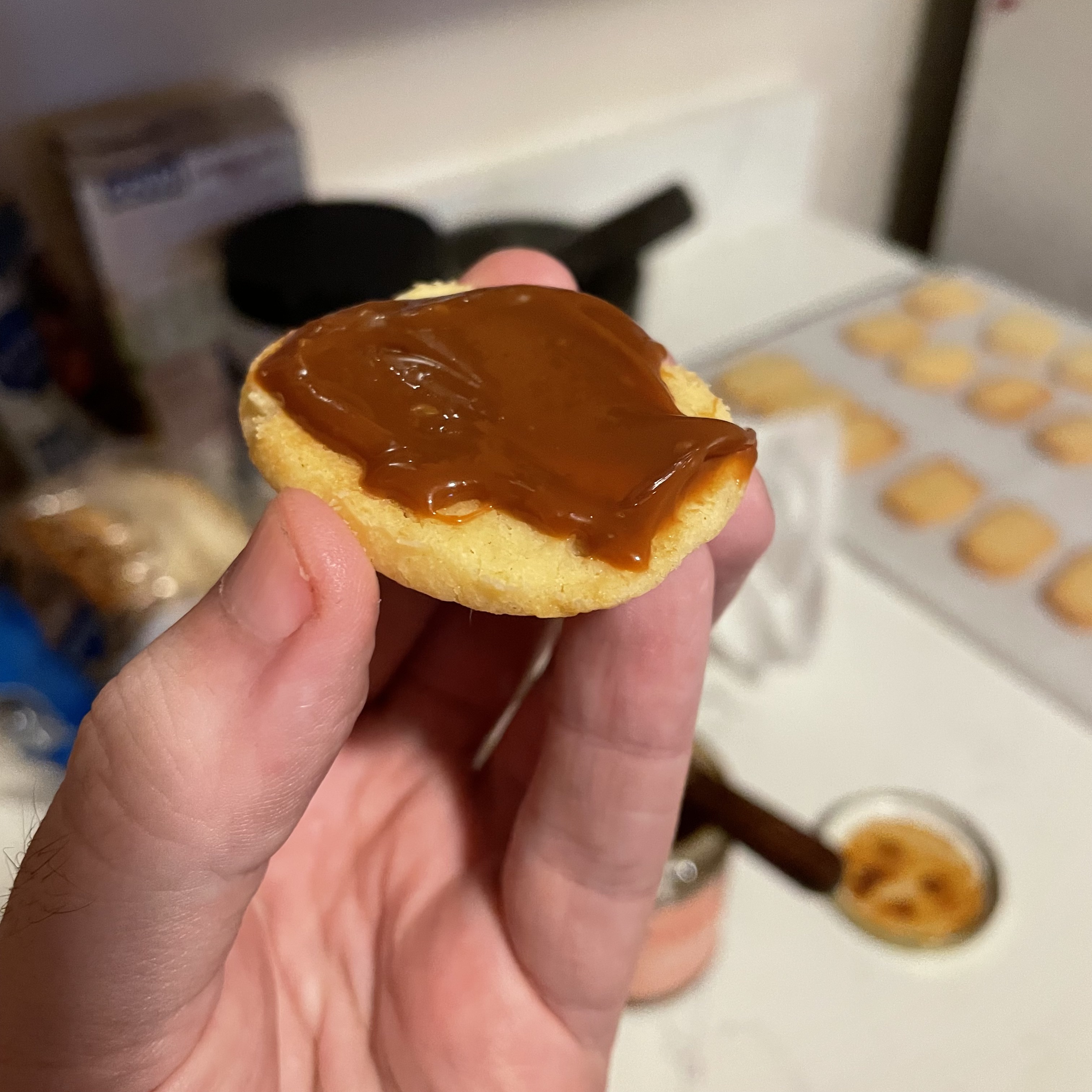 The final step is assembly. With an offset spatula, spread a thin layer of cajeta on the bottom of one cookie, then top with a cookie that’s roughly the same size/shape. Lather/rinse/repeat until you’re out of cookies.
