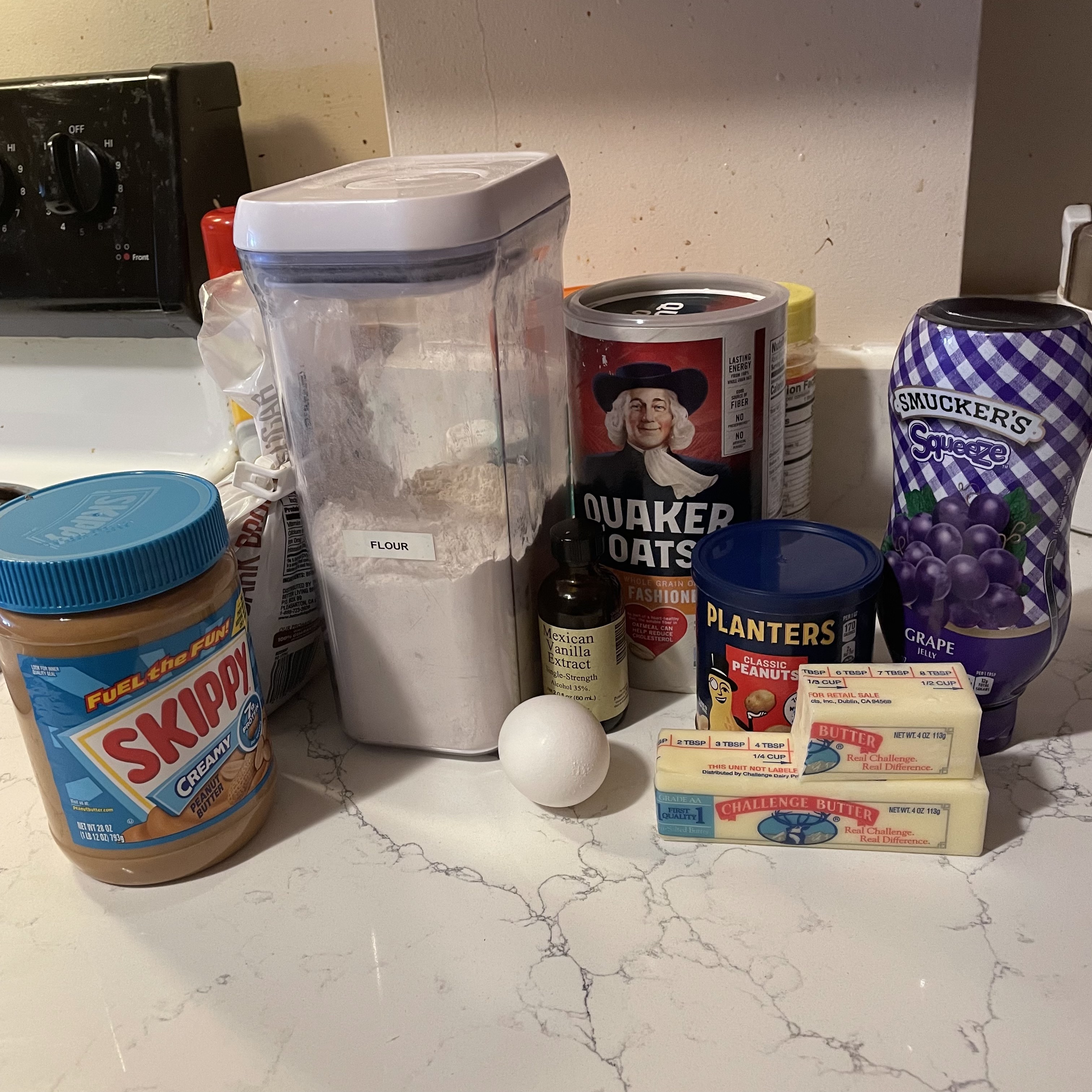 Midway through making these, I realized that the method here is super similar to a hjónabandssæla, a jammy fruit bar that originates from Iceland (if that æ wasn’t a giveaway). That’s got a cookie-ish base (we’ve got an oatmeal cookie base with some peanut butter in the mix here), a jammy filling (typically rhubarb in the original, standard Smucker’s Concord Grape here), and a streusel-y top made from the same makeup as the base (check and check, plus some peanuts for crunch).