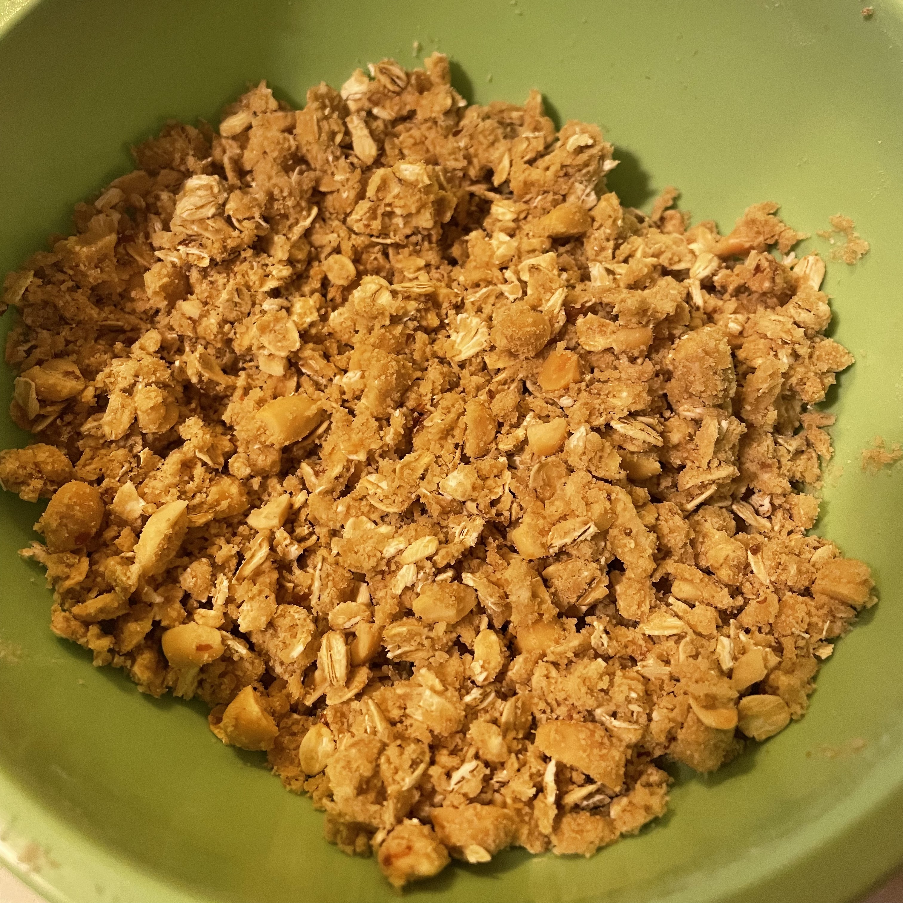 - While the base cooles, prep the streusel: in a medium bowl, combine the flour, brown sugar, oats, and peanuts. Add the butter cubes and press into the dry ingredients with your fingertimes until you have small pea-sized pebbles of streusel. Keep working the butter into the mixture until no pockets of dry flour remain. Set aside.