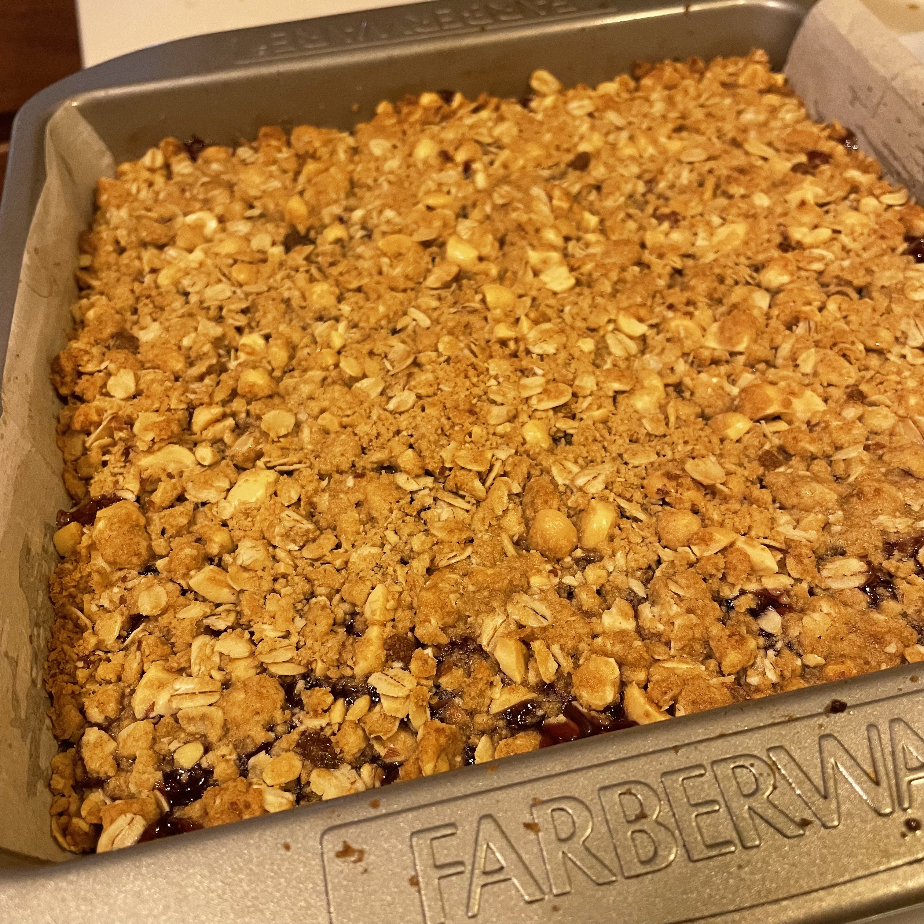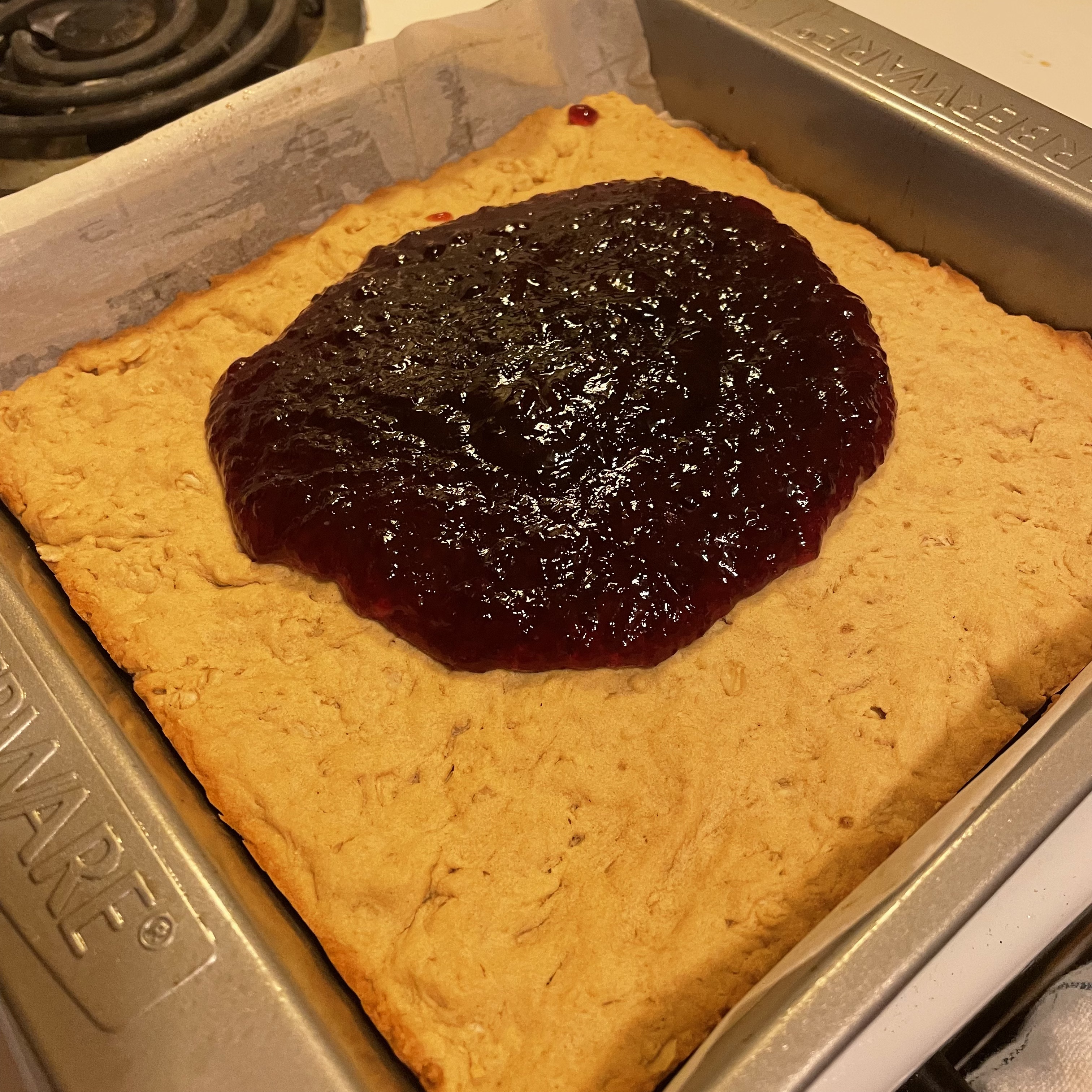 Transfer the jam into a bowl and stir to break up any chunks. Spread over the cookie base with an offset spatual, then scatter the streusel over the top and gently press into the jam with your hands.