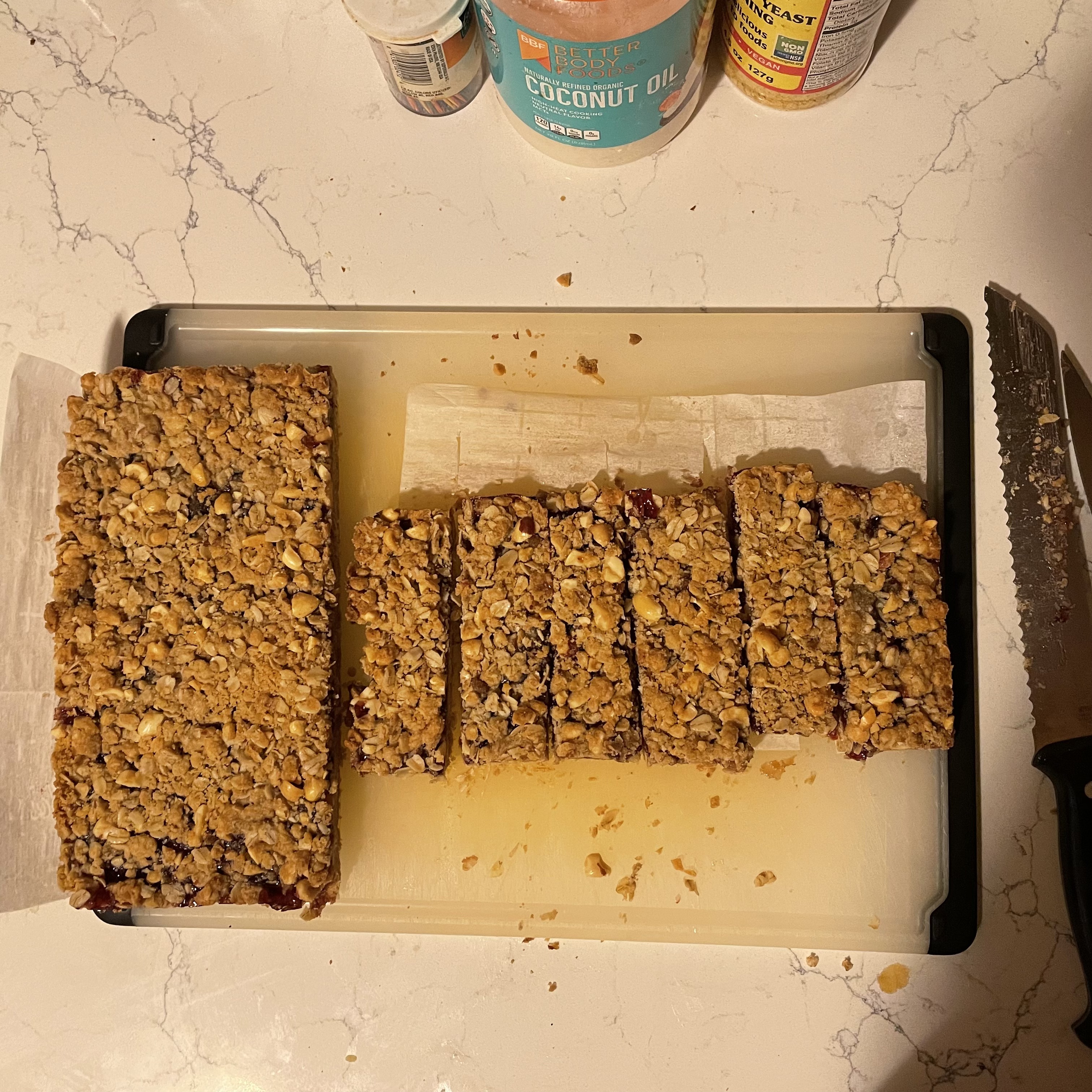 Remove from the pan with your parchment overhang, then slice the bars into two large halves. Slice each half into 6 long planks to make 12 bars.