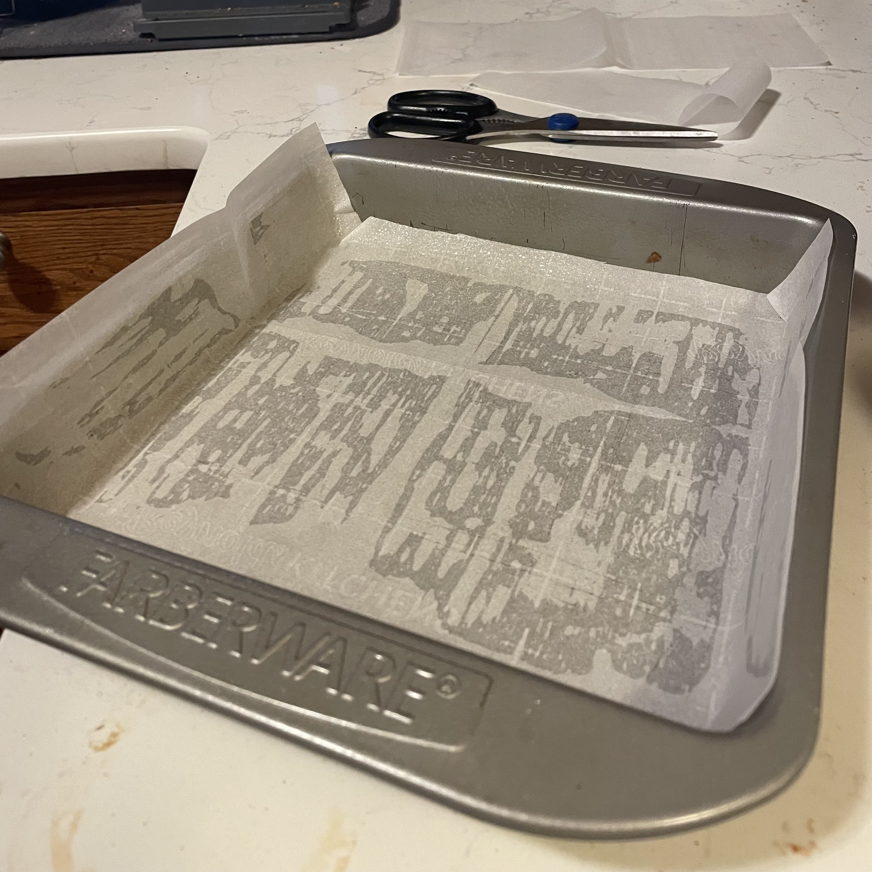 Start out by spraying a square baking pan with cooking spray, then lining it with parchement and letting that overhang a bit so that there’s a handle for removing these later once they’ve cooled.