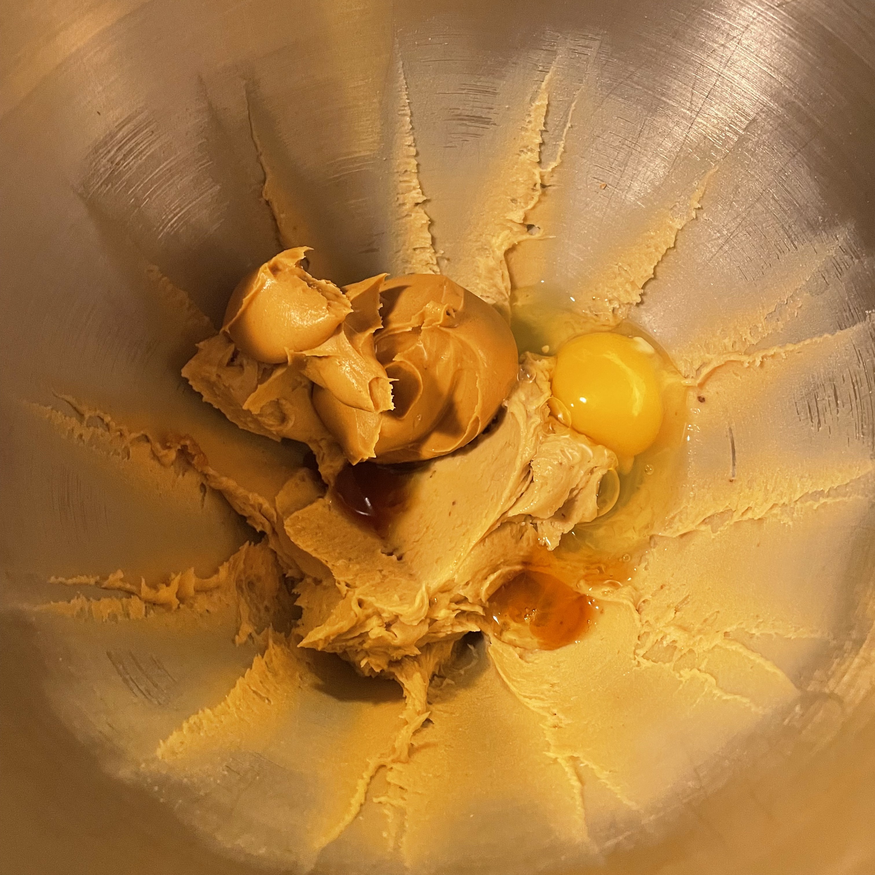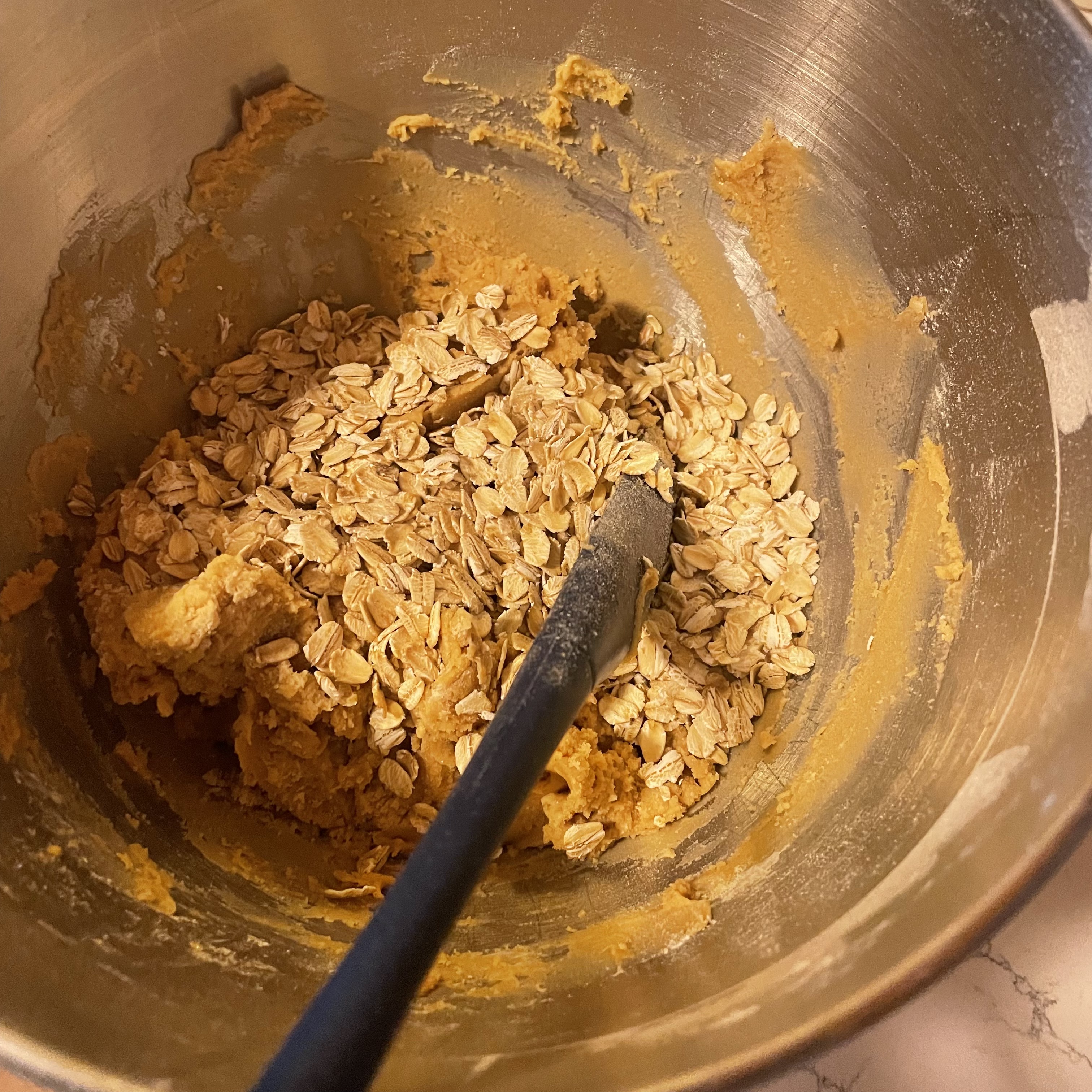 - Turn the mixer off and add the peanut butter, egg, and vanilla extract. Mix on medium until smooth and fluffy, 1-2 minutes. Add the flour and salt and mix on low speed just until a soft dough forms. Remove the bowl from the mixer and stir in the oats with a rubber spatula.