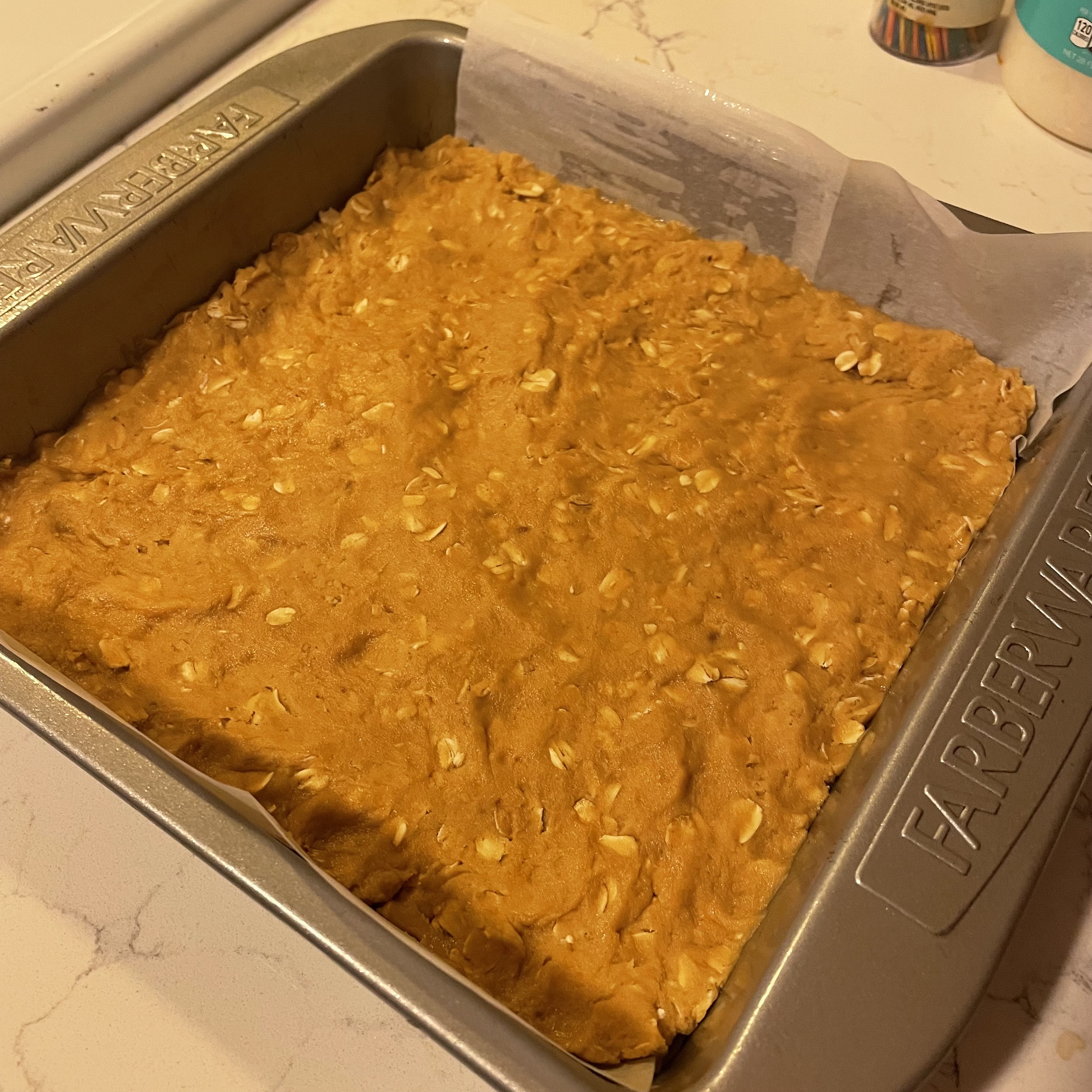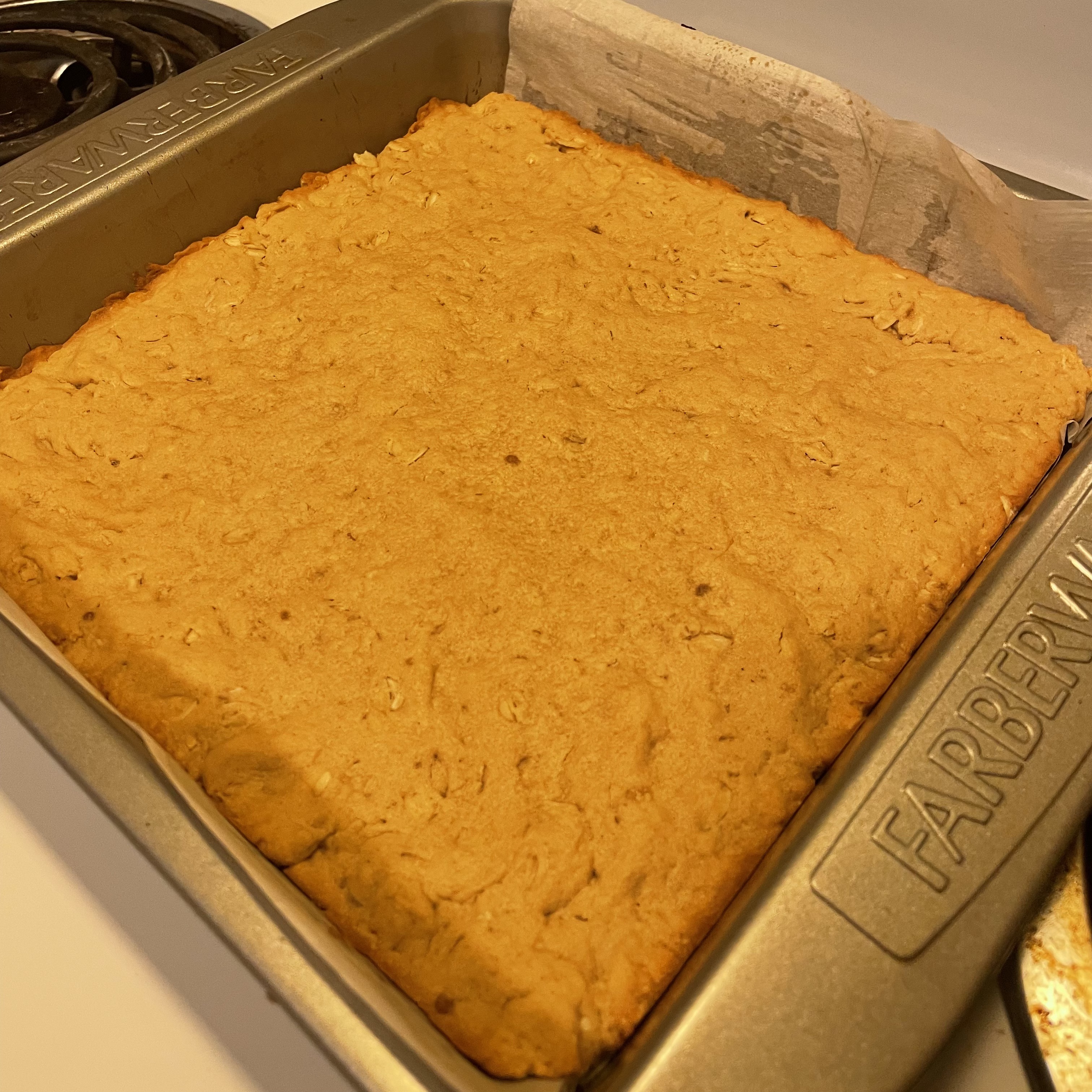 - Transfer the dough to the prepared baking pan and press into an even layer from edge to edge using clean hands or a flat-bottomed measuring cup. Bake until the edges are lightly browned and the base is just barely set, 13-15 minutes. Remove from the oven and let cool for 20 minutes.