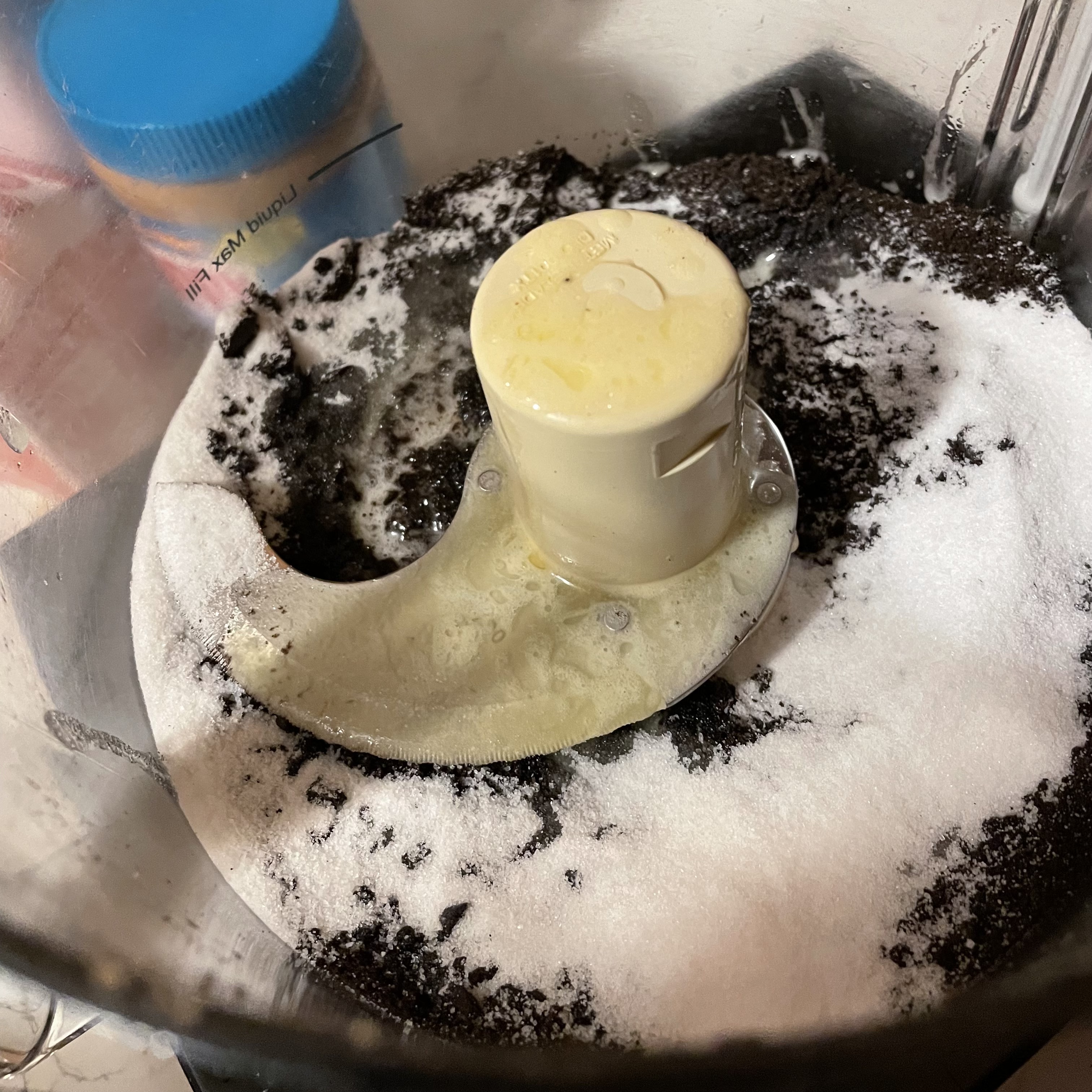 While your oven heats to 350, blend cookie crumbs, melted butter, and 2 tablespoons sugar in processor until moist clumps form.