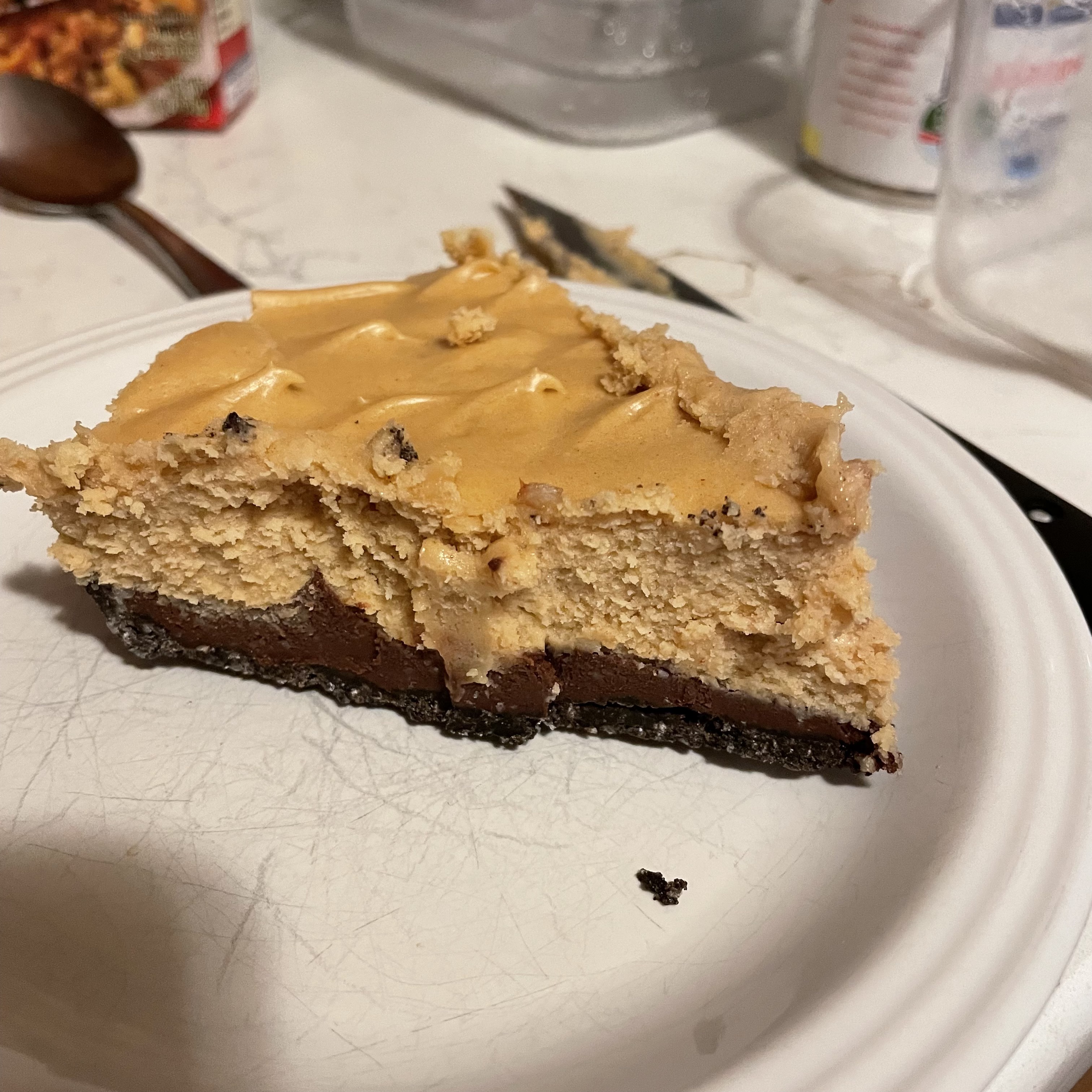 I haven’t done a pie yet (despite it being one of my favorite baking genres), so I’m going to give tribute to what happened here with a pie that (much like the roast) starts out nutty and finishes black. It’s a black-bottom peanut butter pie that’s extra black on the bottom with some chocolate cookie crumbs.
