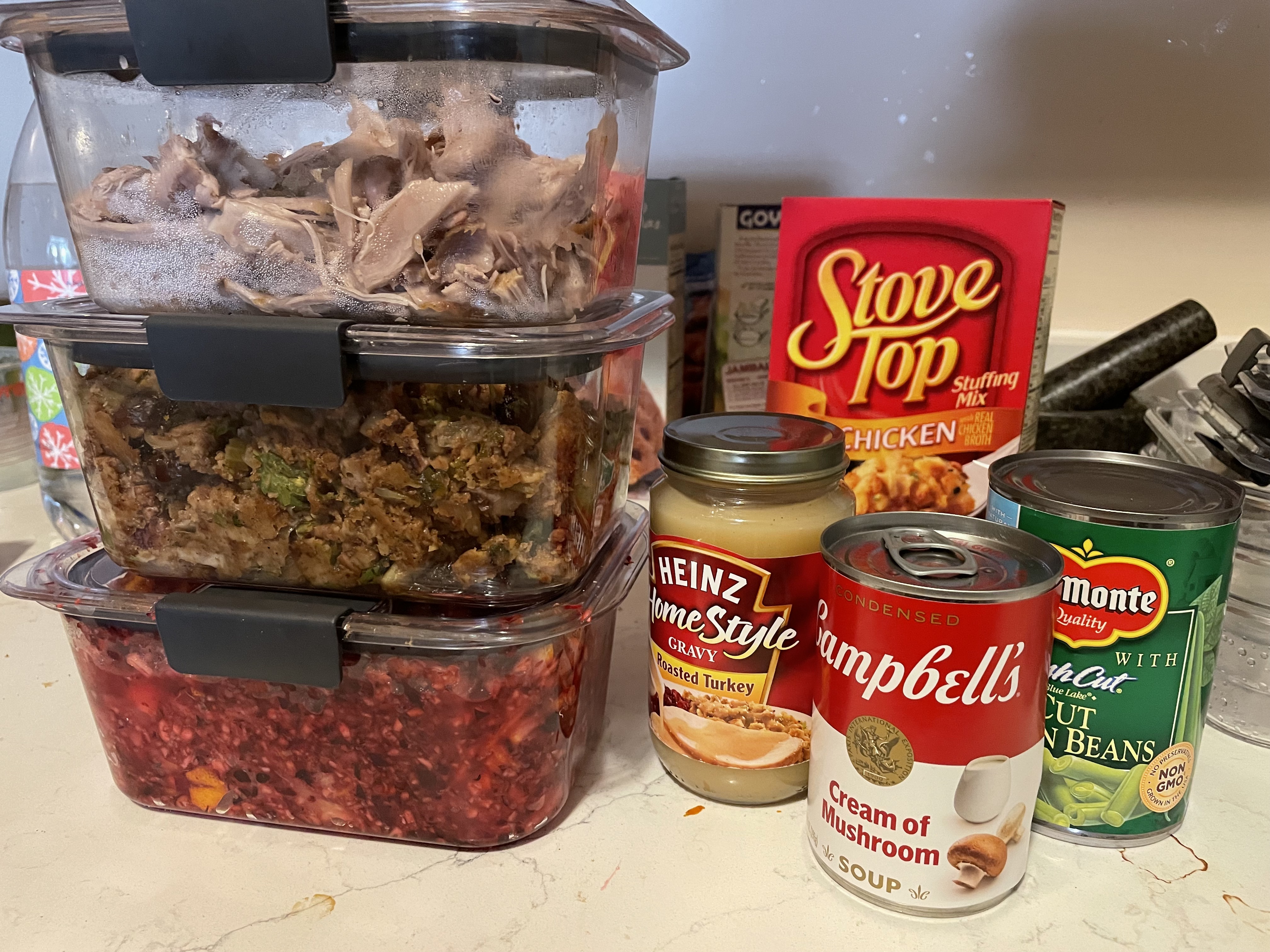 First: gather your leftovers! I had stuffing, turkey, and cranberries left over from Friendsgiving, but picked up a box of Stove Top in case I couldn’t completely cover the bottom of my baking dish, and listened to the part of my brain that was screaming “IT NEEDS A GREEN BEAN CASSEROLE LAYER” and made a night-before-Turkey-Day trip to get a few cans of green beans and some cream of mushroom.