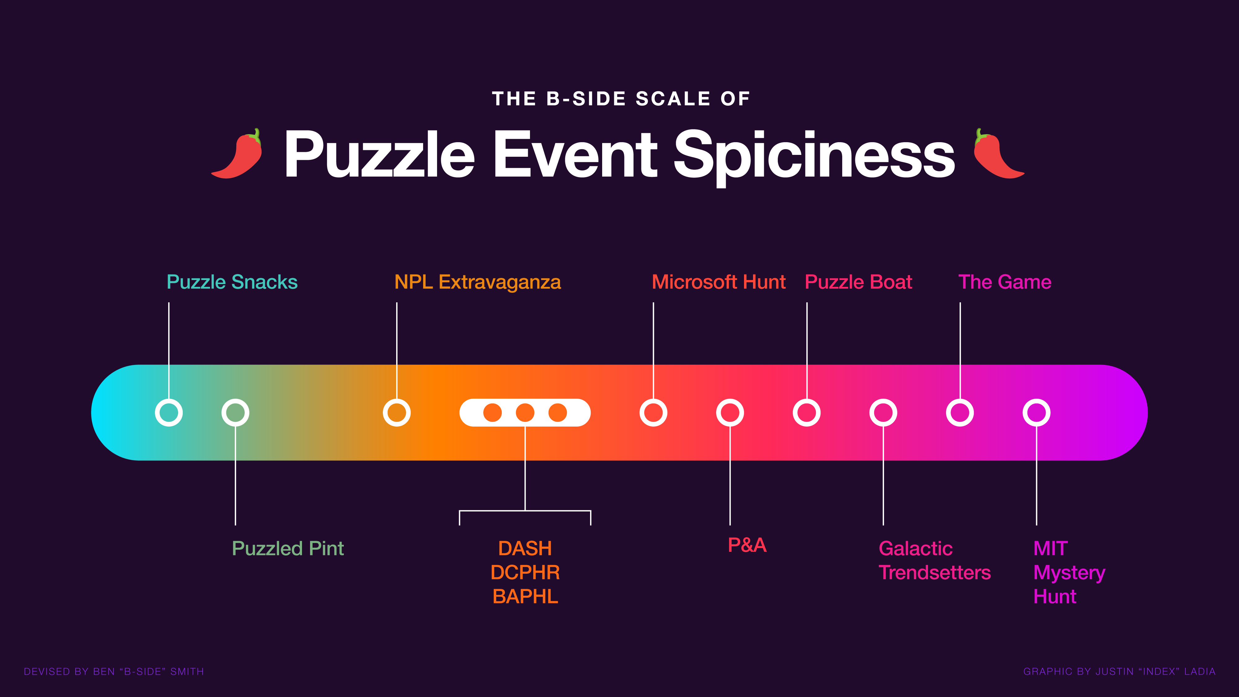 I made an informal puzzle Scoville scale for Hunt Spiciness after doing the Miskatonic Game a few years ago. Should it probably be a two-axis matrix? Yes, but it’s a pretty good explainer on how hard your event as a whole can be. There’s now a need for a puzzle Mohs scale to go along with it - how can you best measure how the individual puzzles within an event make for a varied, appropriately sized event?