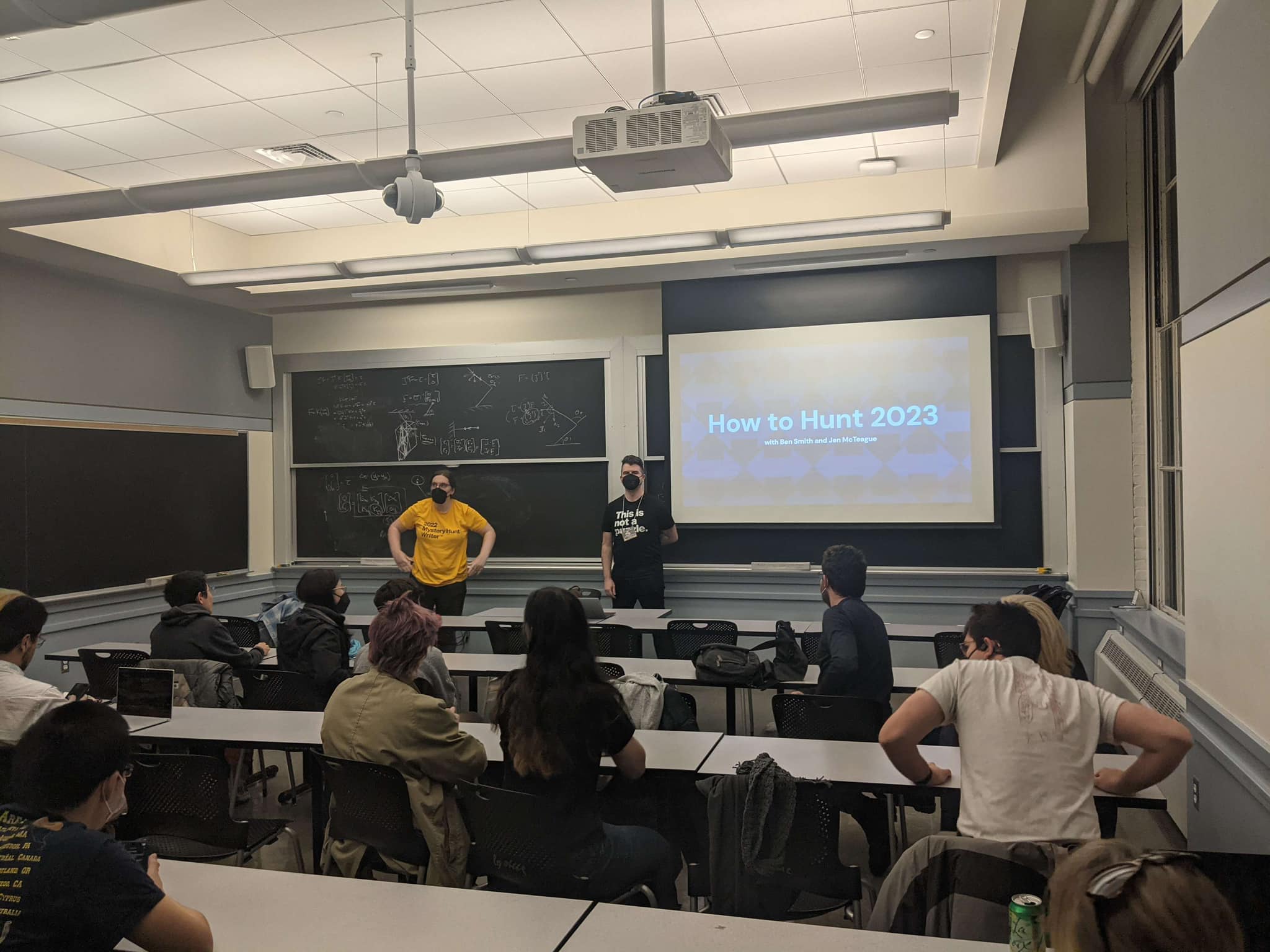 I would have been happy if we were presenting things to 5 curious solvers, so I was blown away that we had a full MIT classroom full of ~50 people excited about this, to the point that people were sitting on the floor (there were chairs available. I don’t get it, but I also have 34-year-old knees). We did an abbreviated version of What Is This and How Can You Do This Safely, then let people loose on the puzzles. Jen was fully in her element as math teacher, and I was glad to revel in watching people solve our stuff. Plus: now I get to say I was a Visiting Speaker at MIT.