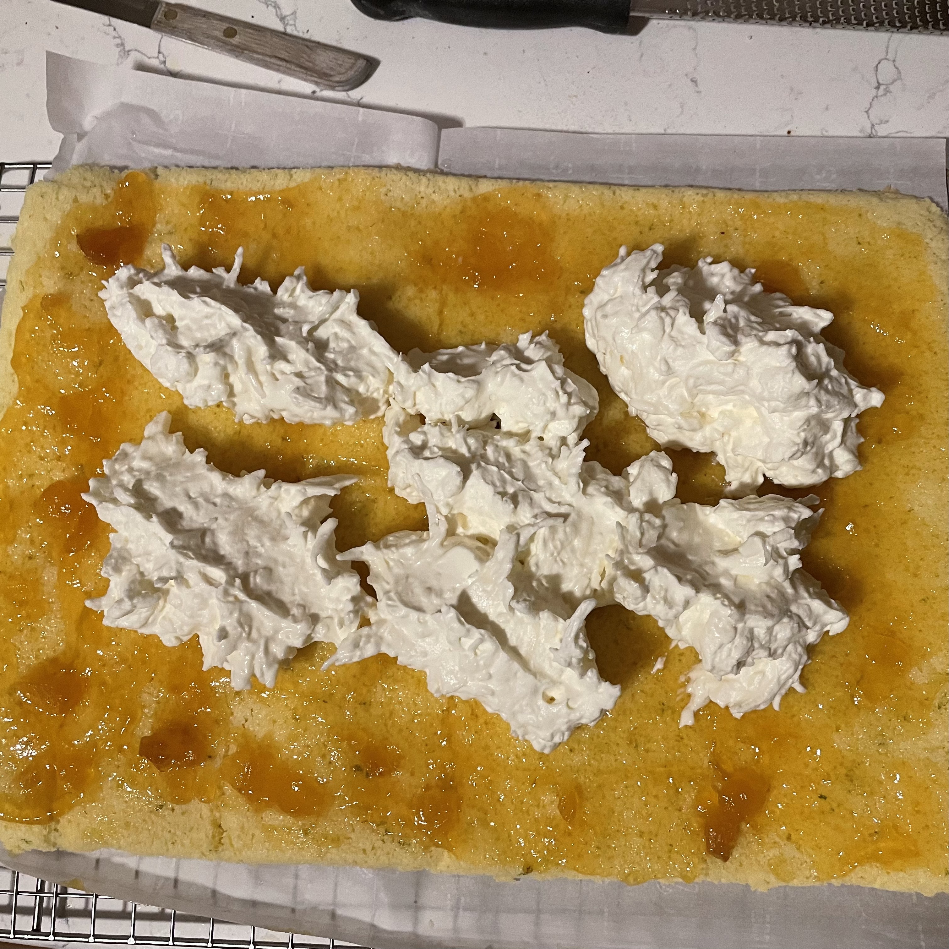 - When ready to roll and decorate, gently unroll the cake and moisten the top with the rest of the pineapple juice. Spread a thin layer of preserves on top of the cake, then spread 2/3 of the whipped cream mixture on top of this. Spread the crushed pineapple evenly on the surface of the whipped cream.